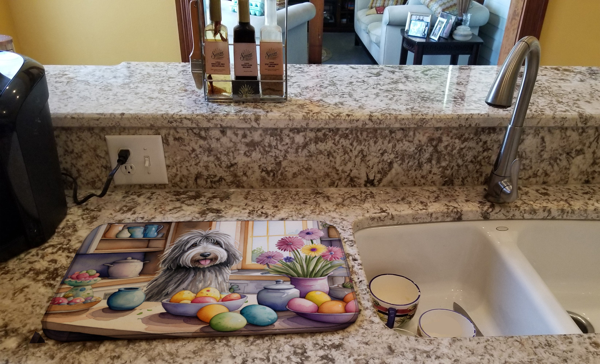 Dish Drying Mat featuring breed specific Bergamasco Sheepdog artwork. Celebrate Easter with this Easter Dish Drying Mat. Say goodbye to messy countertops and soggy dish towels with our innovative dish drying mat. Our high-quality dish drying pad is designed to keep your countertops dry while offering a stylish and efficient solution. Whether you're air drying dishes, glasses, stemware, silverware, pots, pans, bottles, or even fruits and vegetables, our dish mat is the perfect choice. The 14 inches x 22 inches size fits most counters and dish drying racks, and the non-slip design ensures stability. Made with water-absorbent polyester and a polyurethane foam insert, our dish drying mat is not only functional but also durable. It's machine washable and printed in the USA for long-lasting use. The beautiful artwork adds flair to your kitchen decor, making it a perfect housewarming gift or present for any occasion. Upgrade your kitchen experience with our absorbent and versatile dish drying mat.