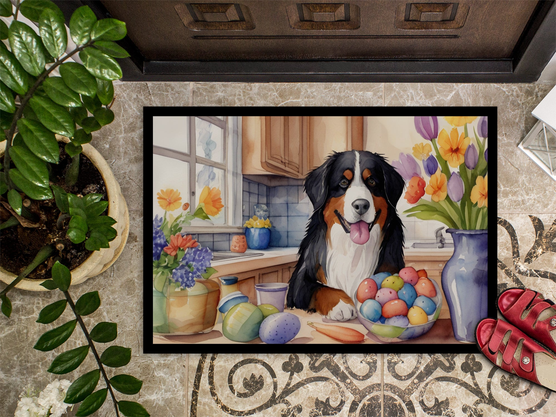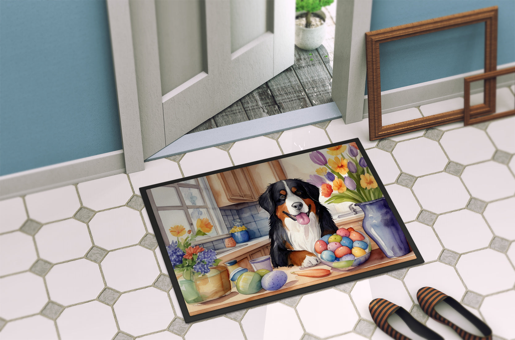Doormat featuring breed specific Bernese Mountain Dog artwork. Celebrate Easter with this Easter Doormat. Welcome your guests in style with our Artwork Door Mat, designed to withstand almost any weather condition. This mat, measuring approximately 24 by 36 inches, is held together by durable black binding tape. Its top layer, composed of polyester felt, is dyed with the eye-catching image you see on the mat. A few layers below provide the mat with stability, while its rubber bottom is stamped to help prevent slipping and ensures safety. Our mat works wonderfully as both an indoor or outdoor door mat. For cleaning, simply hose it off with water or use a power washer - no need for any cleaner that produces suds. Avoid scrubbing with a brush, instead, opt for the vacuum on floor setting. Designed manufactured and printed in the USA, this mat is a perfect addition to your porch, outdoor kitchen, entryway, or any indoor space. Its unique design makes it a charming decorative rug that greets your guests and adds a stylish touch to your home decor.
