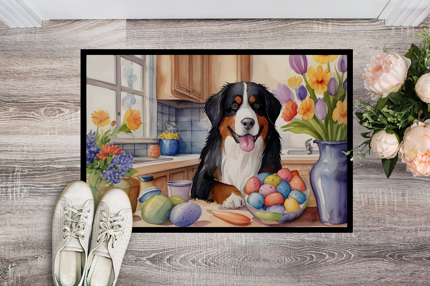 Doormat featuring breed specific Bernese Mountain Dog artwork. Celebrate Easter with this Easter Doormat. Welcome your guests in style with our Artwork Door Mat, designed to withstand almost any weather condition. This mat, measuring approximately 18 by 27 inches, is held together by durable black binding tape. Its top layer, composed of polyester felt, is dyed with the eye-catching image you see on the mat. A few layers below provide the mat with stability, while its rubber bottom is stamped to help prevent slipping and ensures safety. Our mat works wonderfully as both an indoor or outdoor door mat. For cleaning, simply hose it off with water or use a power washer - no need for any cleaner that produces suds. Avoid scrubbing with a brush, instead, opt for the vacuum on floor setting. Designed manufactured and printed in the USA, this mat is a perfect addition to your porch, outdoor kitchen, entryway, or any indoor space. Its unique design makes it a charming decorative rug that greets your guests and adds a stylish touch to your home decor.