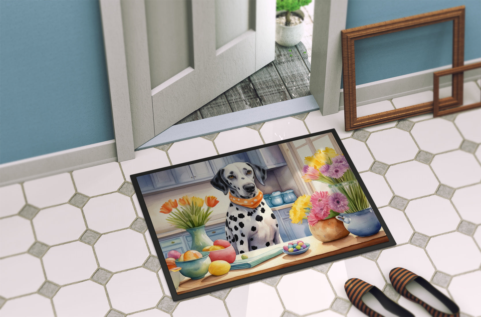 Doormat featuring breed specific Dalmatian artwork. Celebrate Easter with this Easter Doormat. Welcome your guests in style with our Artwork Door Mat, designed to withstand almost any weather condition. This mat, measuring approximately 18 by 27 inches, is held together by durable black binding tape. Its top layer, composed of polyester felt, is dyed with the eye-catching image you see on the mat. A few layers below provide the mat with stability, while its rubber bottom is stamped to help prevent slipping and ensures safety. Our mat works wonderfully as both an indoor or outdoor door mat. For cleaning, simply hose it off with water or use a power washer - no need for any cleaner that produces suds. Avoid scrubbing with a brush, instead, opt for the vacuum on floor setting. Designed manufactured and printed in the USA, this mat is a perfect addition to your porch, outdoor kitchen, entryway, or any indoor space. Its unique design makes it a charming decorative rug that greets your guests and adds a stylish touch to your home decor.
