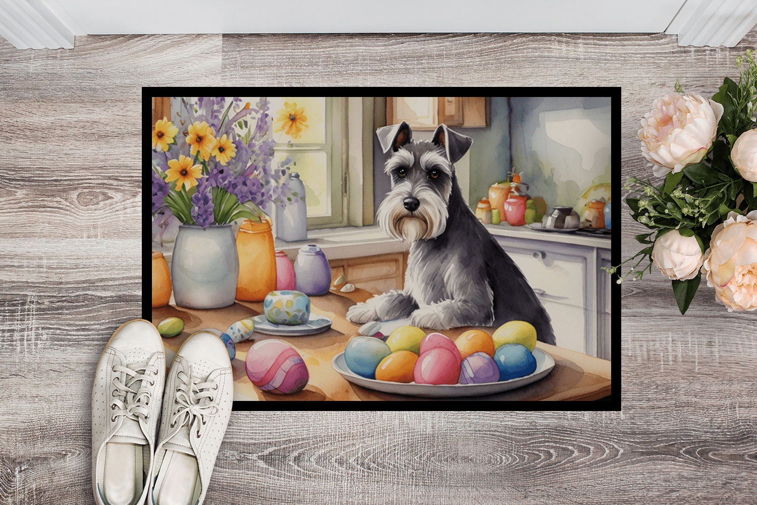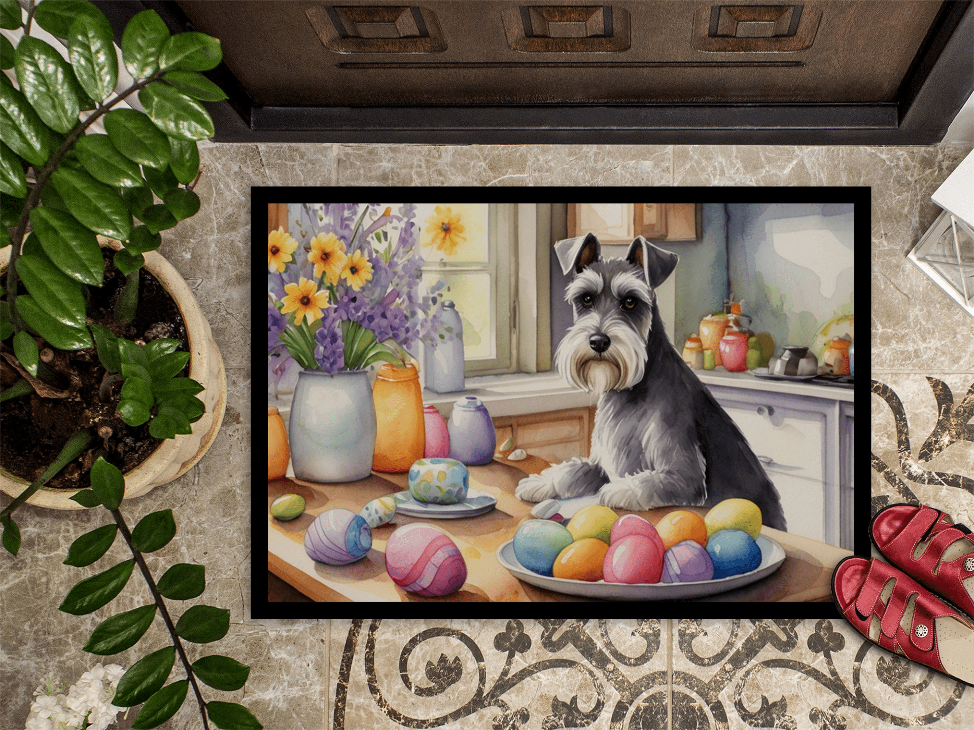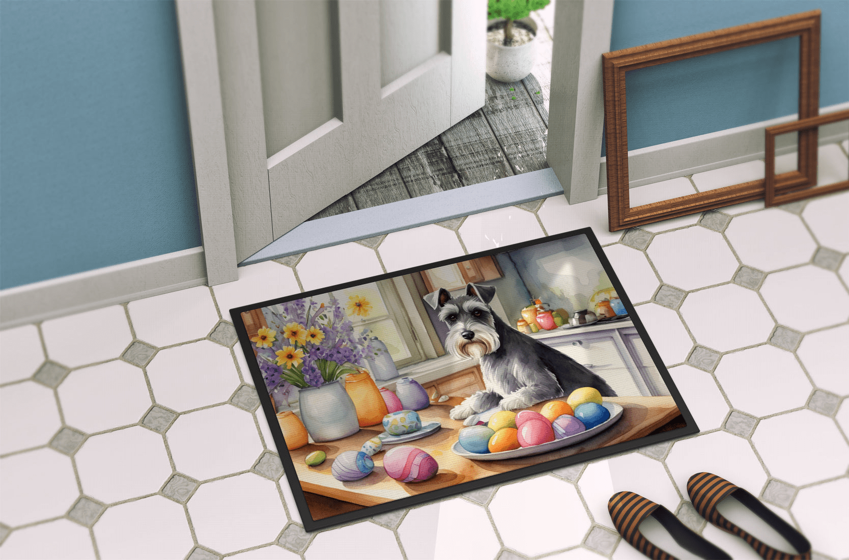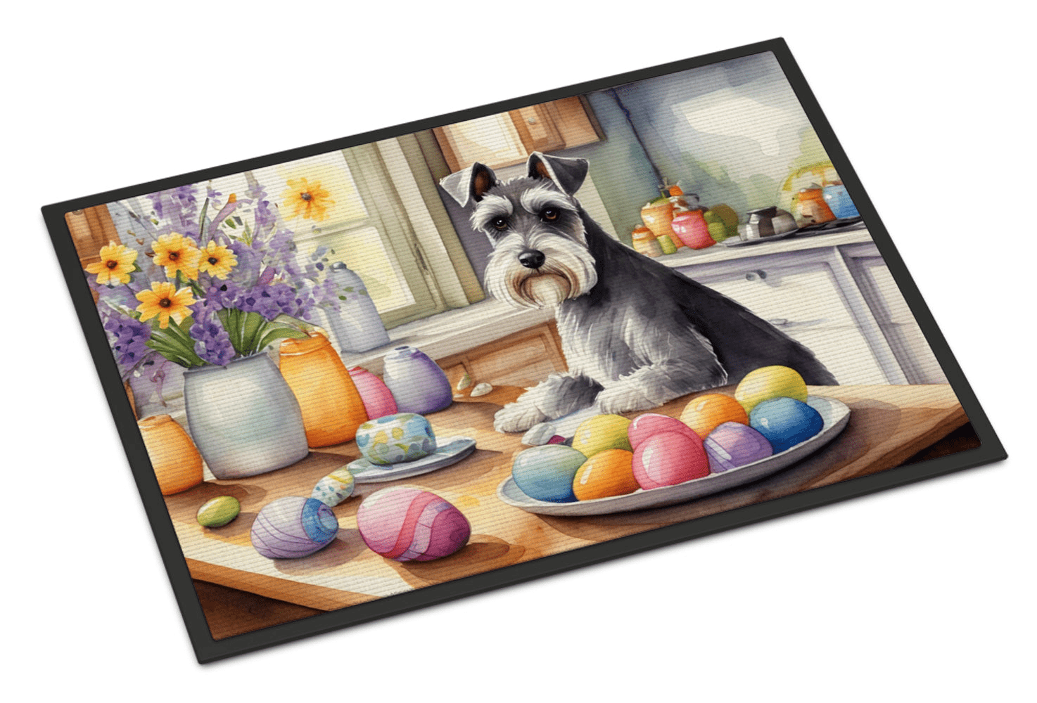 Doormat featuring breed specific Schnauzer artwork. Celebrate Easter with this Easter Doormat. Welcome your guests in style with our Artwork Door Mat, designed to withstand almost any weather condition. This mat, measuring approximately 18 by 27 inches, is held together by durable black binding tape. Its top layer, composed of polyester felt, is dyed with the eye-catching image you see on the mat. A few layers below provide the mat with stability, while its rubber bottom is stamped to help prevent slipping and ensures safety. Our mat works wonderfully as both an indoor or outdoor door mat. For cleaning, simply hose it off with water or use a power washer - no need for any cleaner that produces suds. Avoid scrubbing with a brush, instead, opt for the vacuum on floor setting. Designed manufactured and printed in the USA, this mat is a perfect addition to your porch, outdoor kitchen, entryway, or any indoor space. Its unique design makes it a charming decorative rug that greets your guests and adds a stylish touch to your home decor.