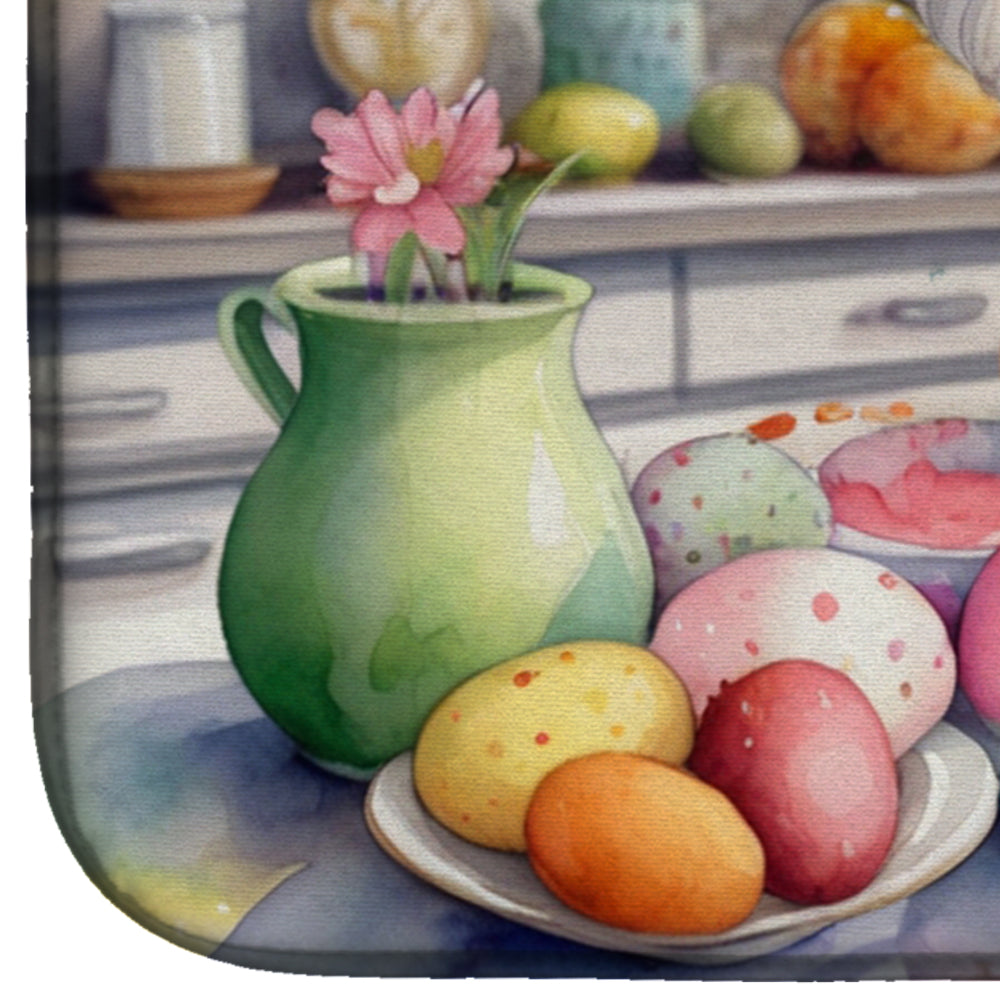 Dish Drying Mat featuring breed specific Poodle artwork. Celebrate Easter with this Easter Dish Drying Mat. Say goodbye to messy countertops and soggy dish towels with our innovative dish drying mat. Our high-quality dish drying pad is designed to keep your countertops dry while offering a stylish and efficient solution. Whether you're air drying dishes, glasses, stemware, silverware, pots, pans, bottles, or even fruits and vegetables, our dish mat is the perfect choice. The 14 inches x 22 inches size fits most counters and dish drying racks, and the non-slip design ensures stability. Made with water-absorbent polyester and a polyurethane foam insert, our dish drying mat is not only functional but also durable. It's machine washable and printed in the USA for long-lasting use. The beautiful artwork adds flair to your kitchen decor, making it a perfect housewarming gift or present for any occasion. Upgrade your kitchen experience with our absorbent and versatile dish drying mat.