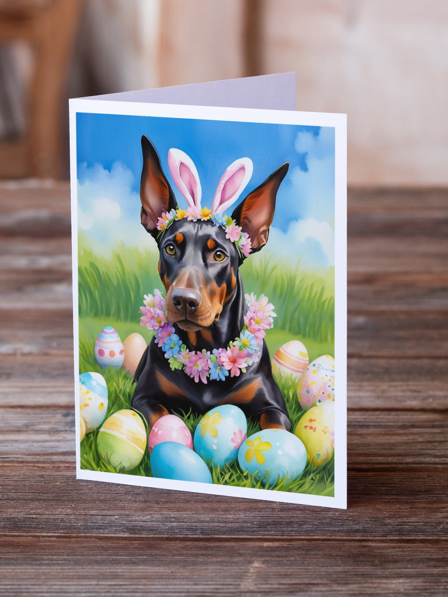 Greeting Cards Pack of 8 featuring breed specific Doberman Pinscher artwork. Celebrate Easter with this Easter . Celebrate special moments with Caroline's Treasures Printed Greeting Card Pack. This pack includes eight beautifully folded 5x7 cards, accompanied by eight matching white envelopes. With blank interiors, these cards provide ample space for your personalized messages and heartfelt holiday greetings. Each card features captivating full-color artwork, meticulously printed in our facility on high-quality 80 lb cover stock or 216 GSM. The super smooth finish of the white cards enhances the visual impact of the artwork, creating a truly stunning presentation. Designed by our talented in-house artists or licensed artists, the artwork on these cards showcases their creativity and attention to detail. From vibrant illustrations to captivating designs, each card tells its own unique story. Whether it's for birthdays, anniversaries, holidays, or any special occasion, Caroline's Treasures Greeting Card Pack is the perfect way to convey your heartfelt sentiments. Share joy, love, and warm wishes with these exquisite cards and make every moment unforgettable.