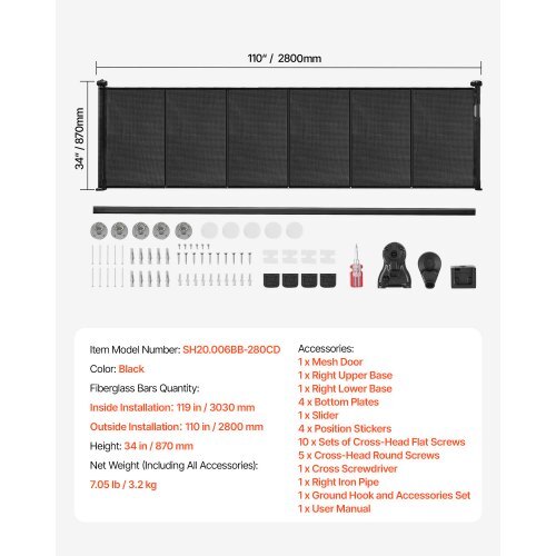 Net Weight (Including All Accessories): 7.05 lb / 3.2 kg,Color:Black,Item Model Number: SH20.006BB-280CD,Max Curtain UnfoldedWidth(Outside Install): 110 in / 2800 mm,Total Height: 34 in/870 mm