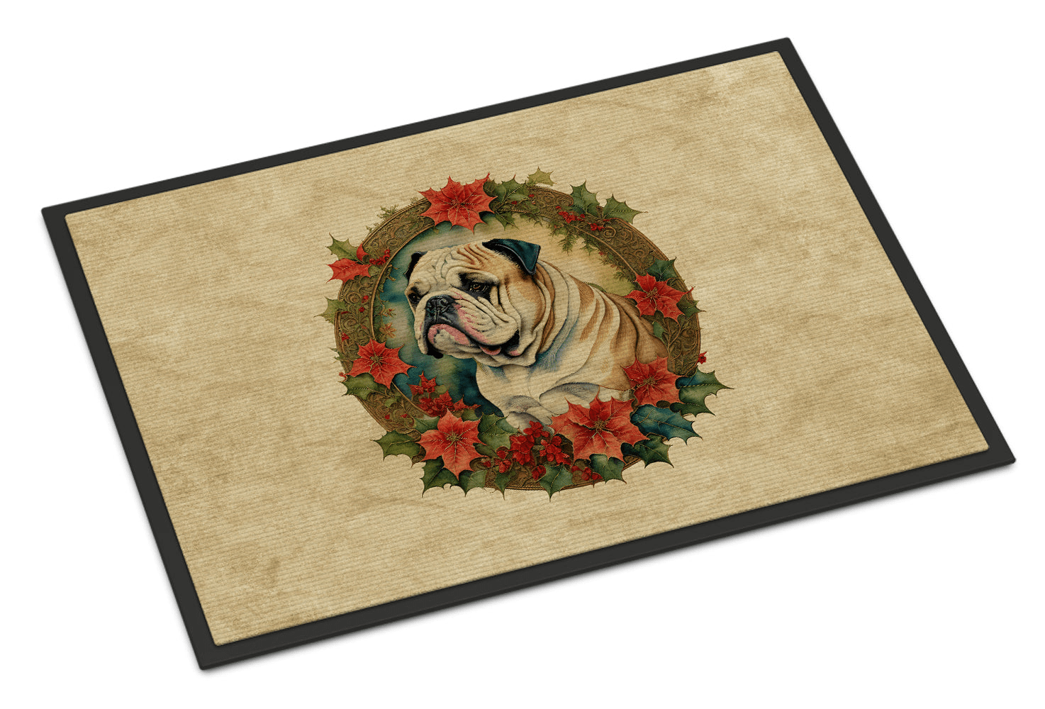 Doormat featuring breed specific English Bulldog artwork. Celebrate Christmas with this Christmas Doormat. Welcome your guests in style with our Artwork Door Mat, designed to withstand almost any weather condition. This mat, measuring approximately 18 by 27 inches, is held together by durable black binding tape. Its top layer, composed of polyester felt, is dyed with the eye-catching image you see on the mat. A few layers below provide the mat with stability, while its rubber bottom is stamped to help prevent slipping and ensures safety. Our mat works wonderfully as both an indoor or outdoor door mat. For cleaning, simply hose it off with water or use a power washer - no need for any cleaner that produces suds. Avoid scrubbing with a brush, instead, opt for the vacuum on floor setting. Designed manufactured and printed in the USA, this mat is a perfect addition to your porch, outdoor kitchen, entryway, or any indoor space. Its unique design makes it a charming decorative rug that greets your guests and adds a stylish touch to your home decor.