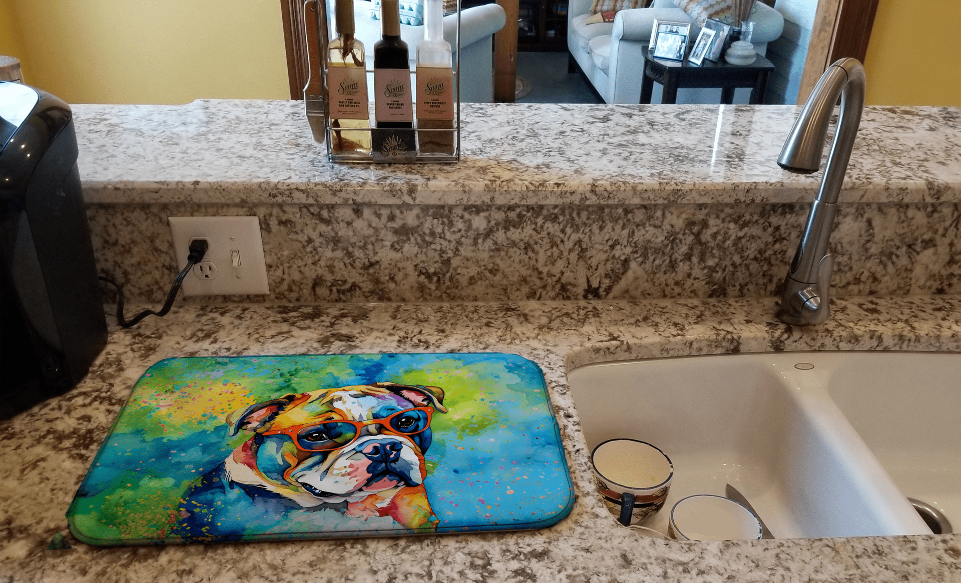 In the heart of your kitchen, our English Bulldog Hippie Dawg Dish Drying Mat brings a touch of whimsy and everyday practicality to your countertop. Designed to keep surfaces dry and towels to a minimum, it blends artful breed-loving charm with a smart drying solution. Your dishes, glasses, and even fresh produce will dry efficiently while your space feels welcoming and stylish. Perfect for pet parents who want style + comfort, it makes daily chores feel a little more luxurious.