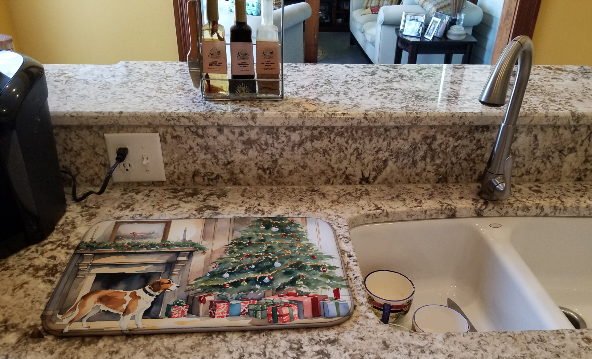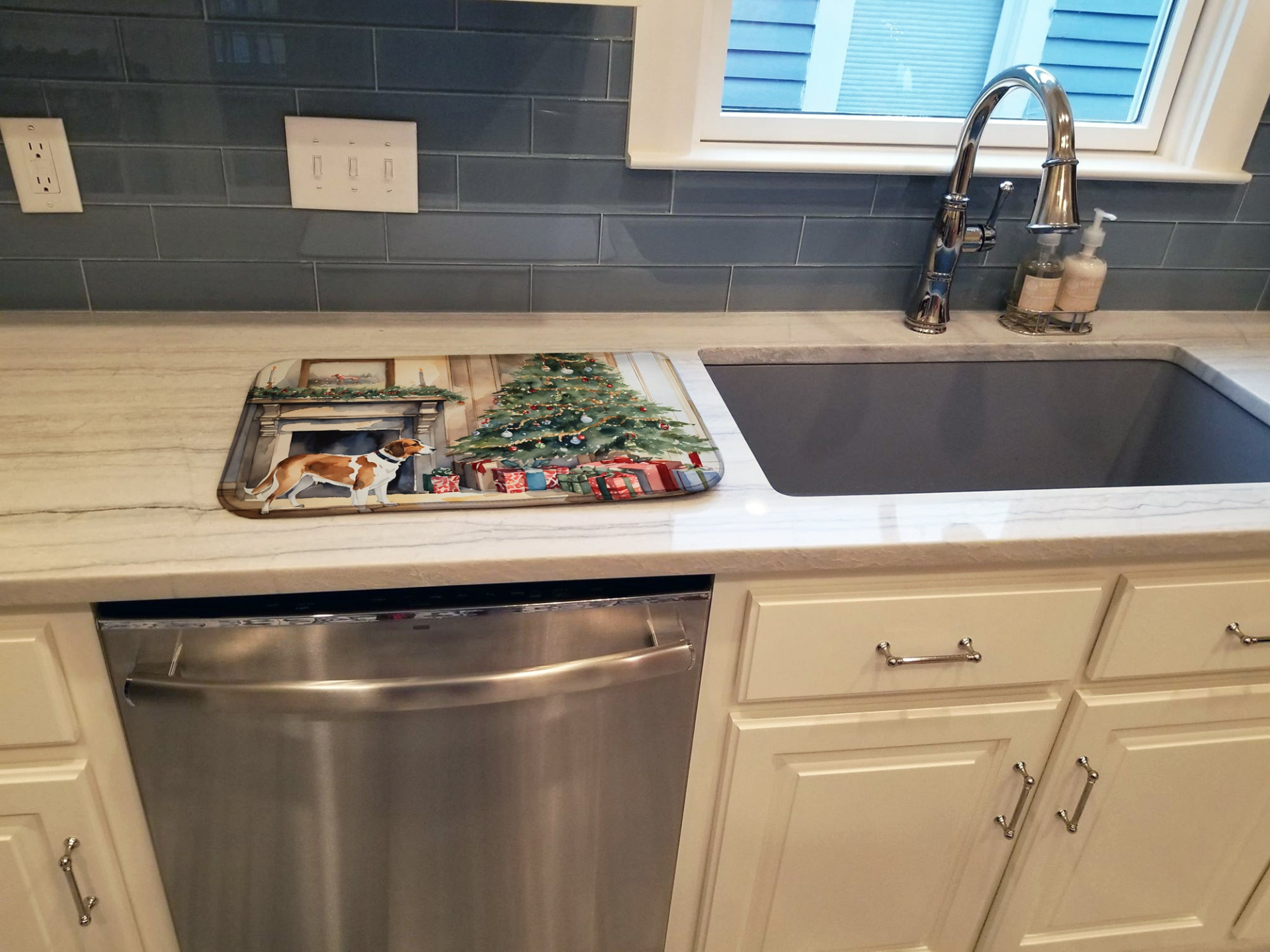Dish Drying Mat featuring breed specific English Foxhound artwork. Celebrate Christmas with this Christmas Dish Drying Mat. Say goodbye to messy countertops and soggy dish towels with our innovative dish drying mat. Our high-quality dish drying pad is designed to keep your countertops dry while offering a stylish and efficient solution. Whether you're air drying dishes, glasses, stemware, silverware, pots, pans, bottles, or even fruits and vegetables, our dish mat is the perfect choice. The 14 inches x 22 inches size fits most counters and dish drying racks, and the non-slip design ensures stability. Made with water-absorbent polyester and a polyurethane foam insert, our dish drying mat is not only functional but also durable. It's machine washable and printed in the USA for long-lasting use. The beautiful artwork adds flair to your kitchen decor, making it a perfect housewarming gift or present for any occasion. Upgrade your kitchen experience with our absorbent and versatile dish drying mat.