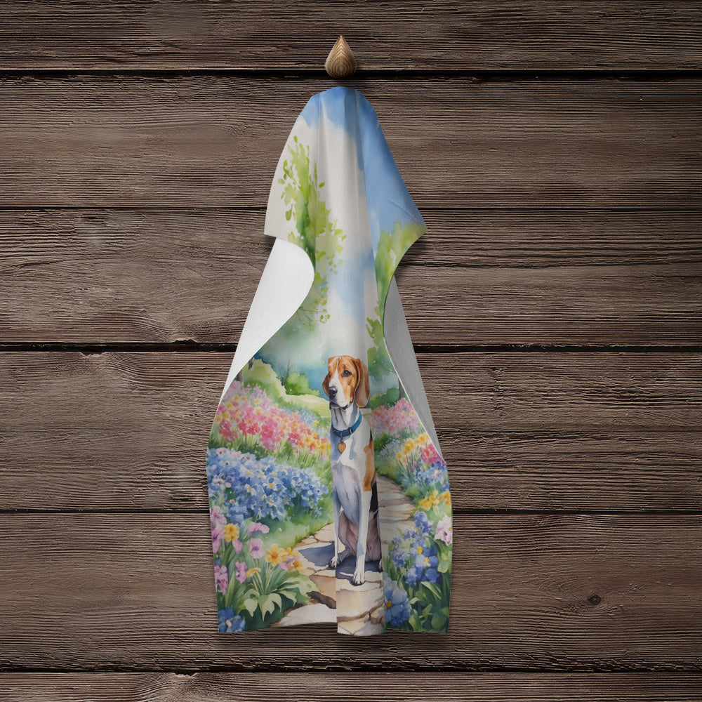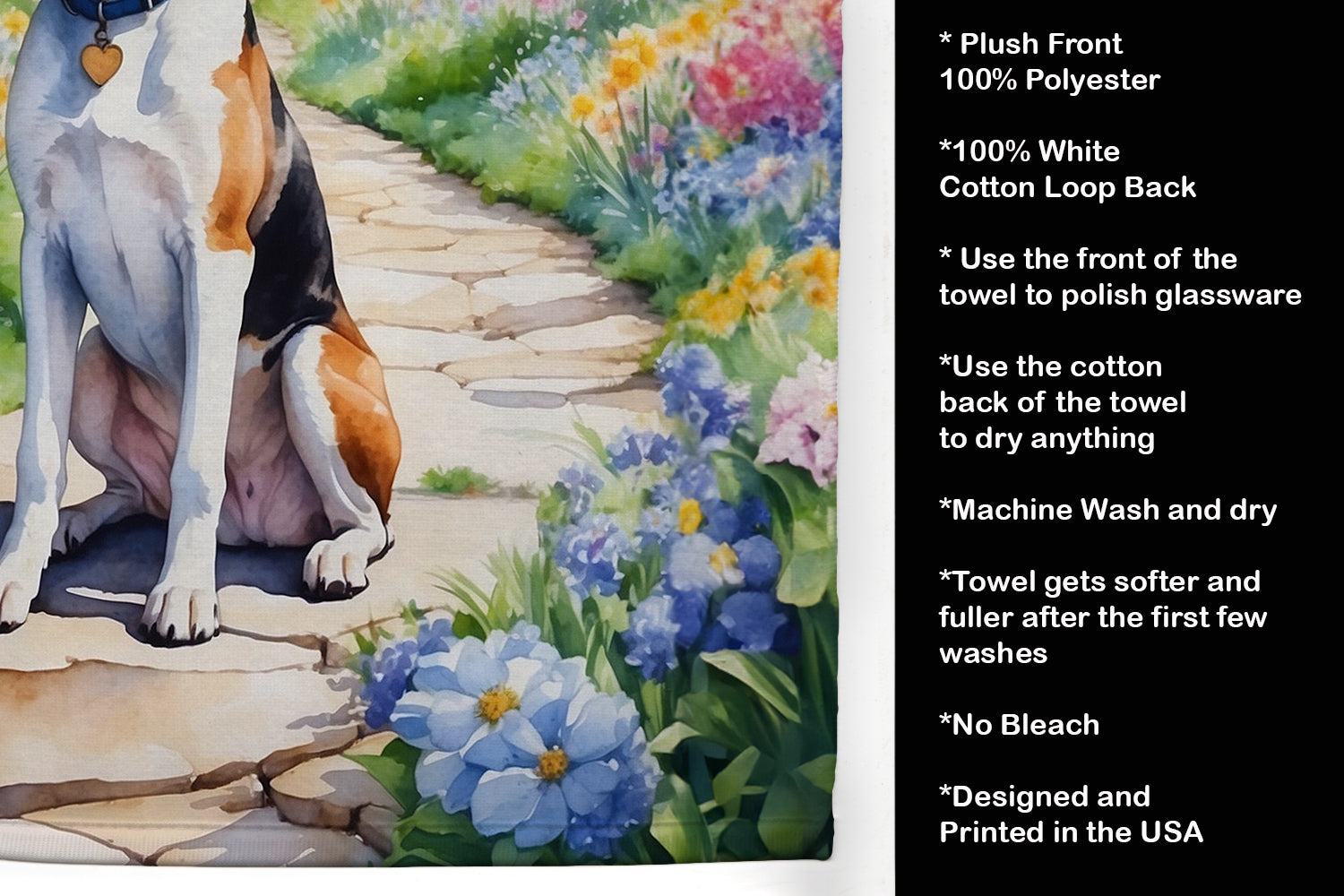 Kitchen Towel featuring breed specific English Foxhound artwork. Experience the perfect blend of aesthetic appeal and functional excellence with our Plush Velour Kitchen Towels. These are not your ordinary decorative kitchen towels that gather dust. Instead, they are designed to be as practical as they are stylish. The front layer of our towel is constructed from a minky plush polyester, known for its durability and color retention. Unlike conventional kitchen towels, the artwork on our towels is dyed directly into the fabric, ensuring vibrant colors that last. Polish your glassware to a brilliant sparkle using the plush front side of the towel. Flip to the back, crafted from 100% cotton terry loop, to exploit its exceptional absorbency for drying dishes or wiping down counters. Our kitchen towels redefine the concept of functional art, offering lasting quality that maintains the towel's shape over time. Measuring 15 inches by 25 inches and weighing 2.3 lbs per dozen, these towels deliver an overwhelming sensory experience with their soft, plush, and smooth texture. The edges are meticulously finished with binding, enhancing their durability and visual appeal. For your convenience, these towels are machine washable and can be dried on low heat. After the first wash, the top fabric becomes even softer and fluffier, eliminating the need for ironing. Treat your kitchen to the luxury and functionality it deserves with our plush velour kitchen towels.