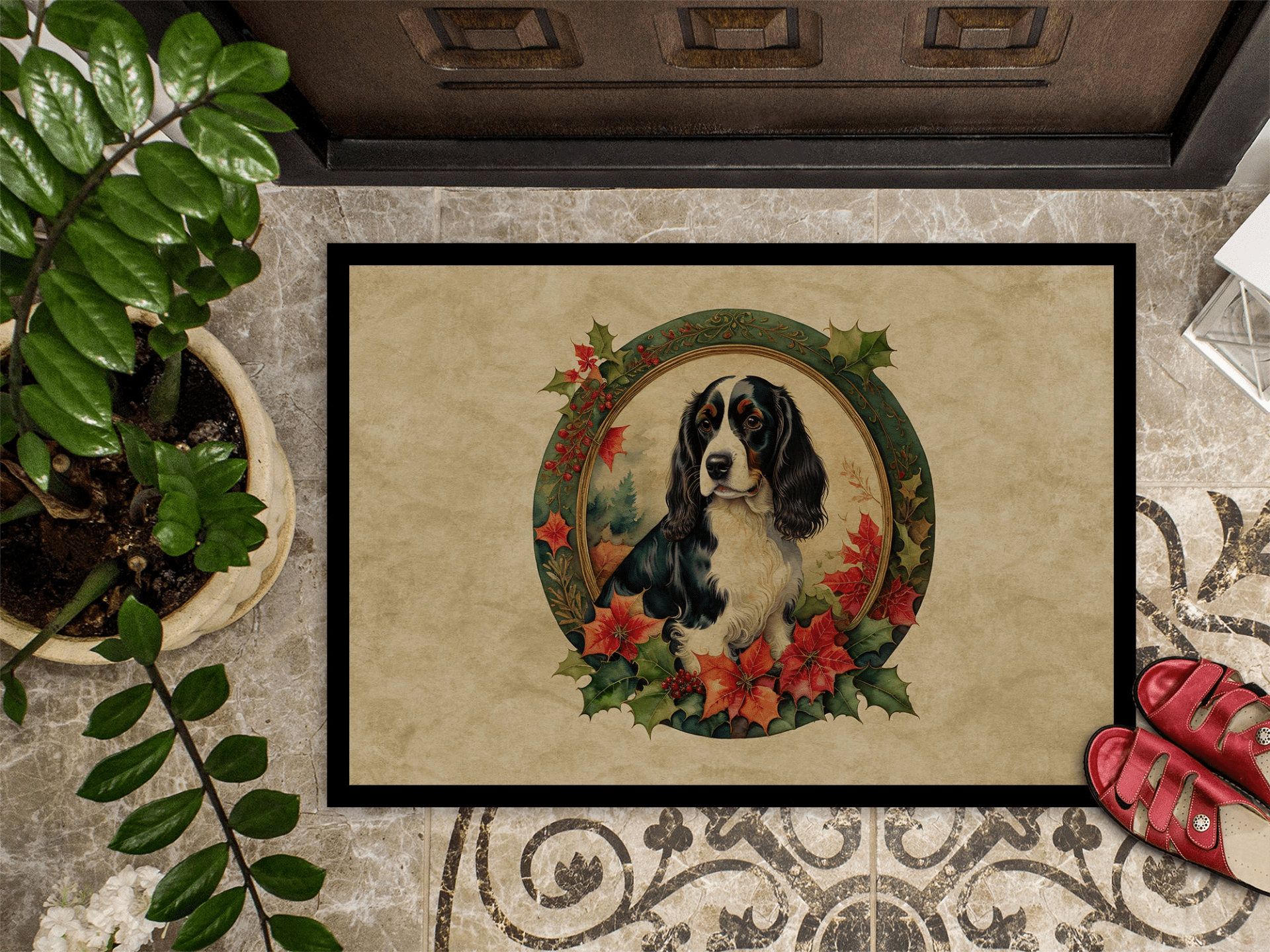 Doormat featuring breed specific English Springer Spaniel artwork. Celebrate Christmas with this Christmas Doormat. Welcome your guests in style with our Artwork Door Mat, designed to withstand almost any weather condition. This mat, measuring approximately 18 by 27 inches, is held together by durable black binding tape. Its top layer, composed of polyester felt, is dyed with the eye-catching image you see on the mat. A few layers below provide the mat with stability, while its rubber bottom is stamped to help prevent slipping and ensures safety. Our mat works wonderfully as both an indoor or outdoor door mat. For cleaning, simply hose it off with water or use a power washer - no need for any cleaner that produces suds. Avoid scrubbing with a brush, instead, opt for the vacuum on floor setting. Designed manufactured and printed in the USA, this mat is a perfect addition to your porch, outdoor kitchen, entryway, or any indoor space. Its unique design makes it a charming decorative rug that greets your guests and adds a stylish touch to your home decor.