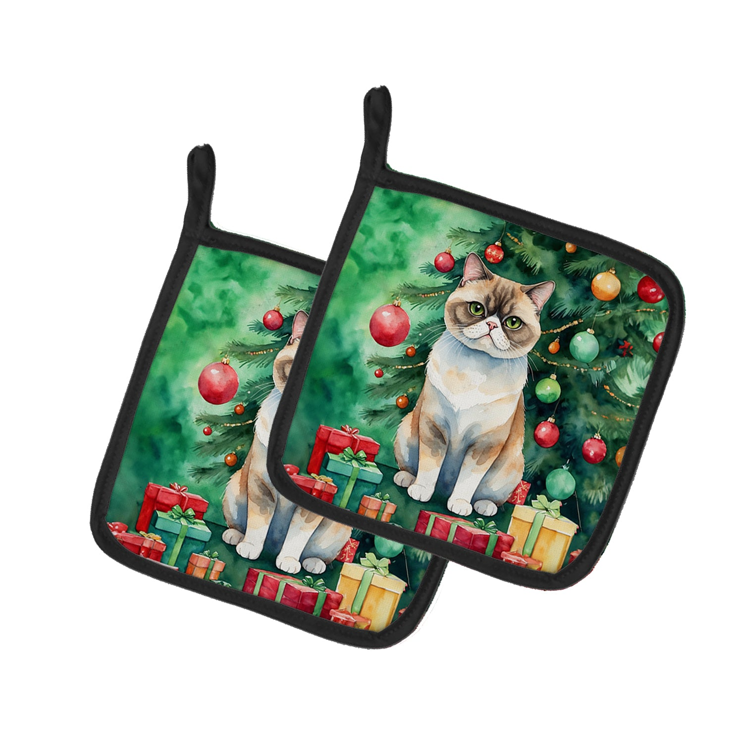Exotic Shorthair Cat By the Christmas Tree Pair of Pot Holders