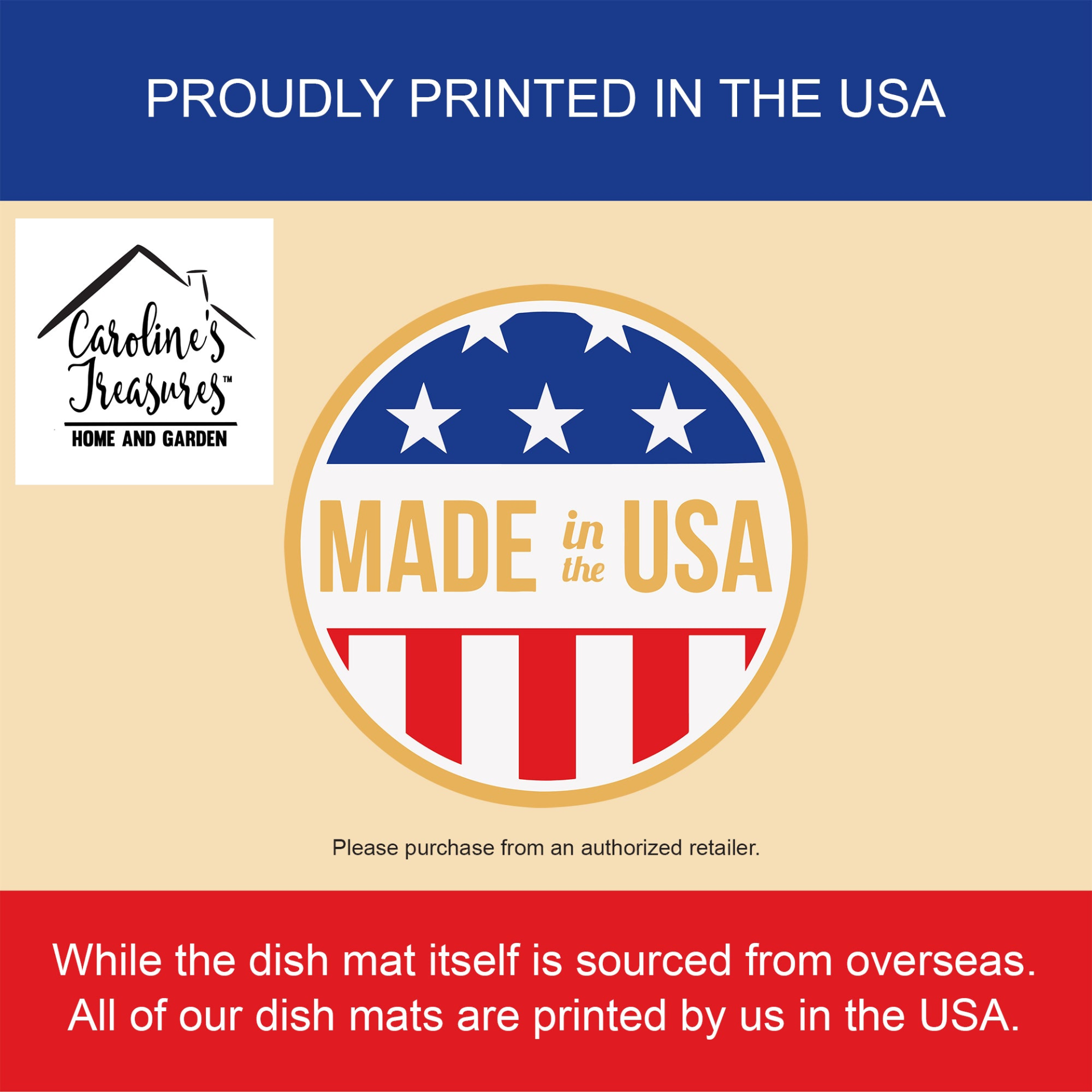 Dish Drying Mat featuring breed specific French Bulldog artwork. Say goodbye to messy countertops and soggy dish towels with our innovative dish drying mat. Our high-quality dish drying pad is designed to keep your countertops dry while offering a stylish and efficient solution. Whether you're air drying dishes, glasses, stemware, silverware, pots, pans, bottles, or even fruits and vegetables, our dish mat is the perfect choice. The 14 inches x 22 inches size fits most counters and dish drying racks, and the non-slip design ensures stability. Made with water-absorbent polyester and a polyurethane foam insert, our dish drying mat is not only functional but also durable. It's machine washable and printed in the USA for long-lasting use. The beautiful artwork adds flair to your kitchen decor, making it a perfect housewarming gift or present for any occasion. Upgrade your kitchen experience with our absorbent and versatile dish drying mat.