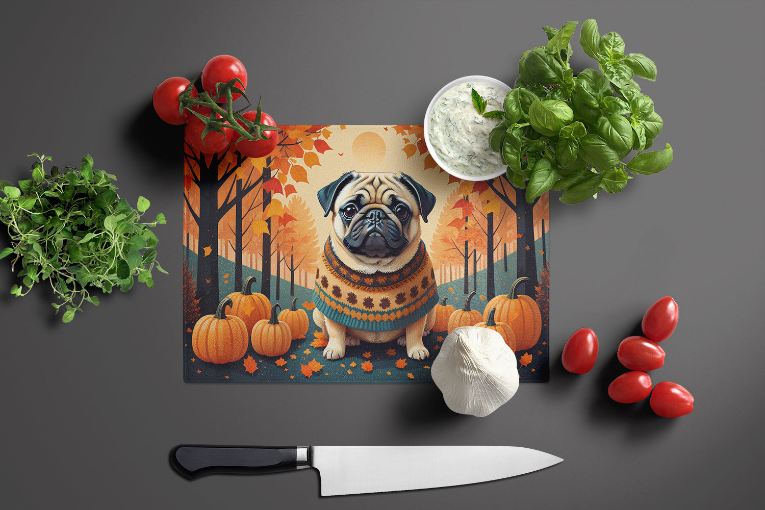 Glass Cutting Board featuring breed specific Pug artwork. Introduce your kitchen to the vibrant, large Decorative Glass Cutting Board from Caroline's Treasures. Crafted from resilient tempered glass, this board is not only a utilitarian necessity but also a colorful art piece. With its generous dimensions of 15 inches in height and 12 inches in length, it offers ample space for all your cutting needs. Every piece showcases captivating artwork from distinguished artists, bringing an aesthetic edge to your kitchen. Beyond its attractive design, this cutting board ensures your countertop stays pristine and unscathed, owing to its heat-resistant properties. Engineered with user convenience in mind, it features non-skid feet for stability, and rounded corners for additional safety. Its robust construction renders it virtually unbreakable, guaranteeing longevity. The board comes with protective feet bumpers, maintaining its position during use. This product is recommended to be hand washed only. Proudly printed and assembled in the United States, this cutting board exemplifies superior craftsmanship. With Caroline's Treasures' Decorative Glass Cutting Board, you're investing in a blend of functionality and artistic flair.
