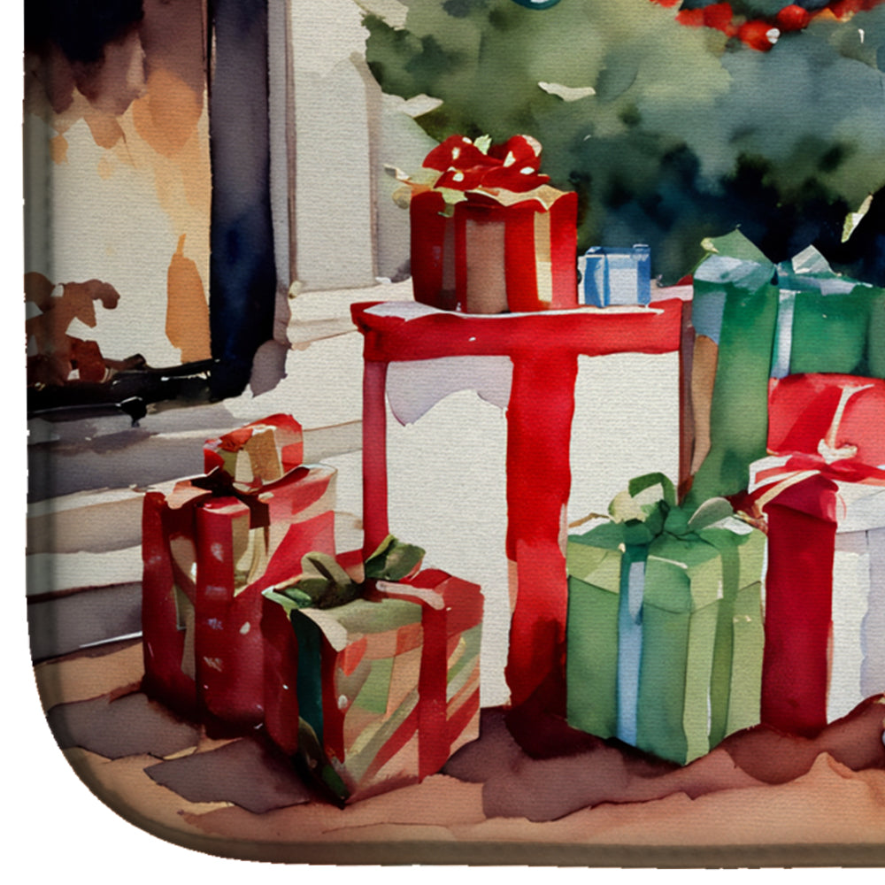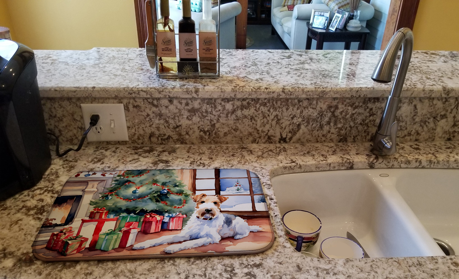 Dish Drying Mat featuring breed specific Fox Terrier artwork. Celebrate Christmas with this Christmas Dish Drying Mat. Say goodbye to messy countertops and soggy dish towels with our innovative dish drying mat. Our high-quality dish drying pad is designed to keep your countertops dry while offering a stylish and efficient solution. Whether you're air drying dishes, glasses, stemware, silverware, pots, pans, bottles, or even fruits and vegetables, our dish mat is the perfect choice. The 14 inches x 22 inches size fits most counters and dish drying racks, and the non-slip design ensures stability. Made with water-absorbent polyester and a polyurethane foam insert, our dish drying mat is not only functional but also durable. It's machine washable and printed in the USA for long-lasting use. The beautiful artwork adds flair to your kitchen decor, making it a perfect housewarming gift or present for any occasion. Upgrade your kitchen experience with our absorbent and versatile dish drying mat.