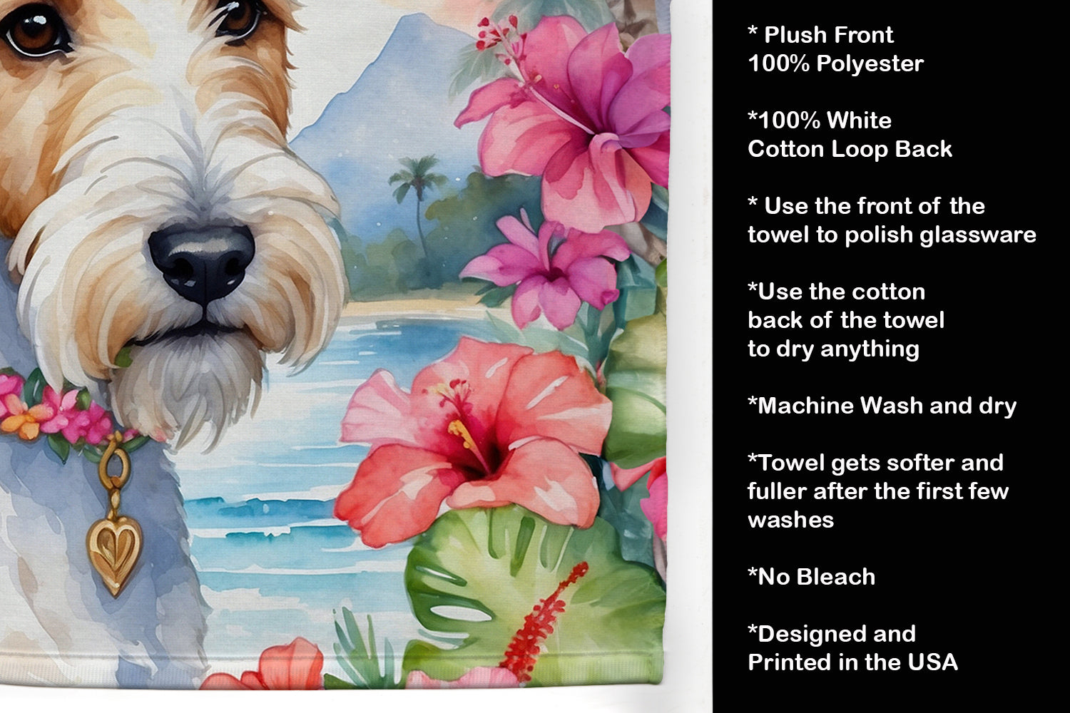 Kitchen Towel featuring breed specific Fox Terrier artwork. Experience the perfect blend of aesthetic appeal and functional excellence with our Plush Velour Kitchen Towels. These are not your ordinary decorative kitchen towels that gather dust. Instead, they are designed to be as practical as they are stylish. The front layer of our towel is constructed from a minky plush polyester, known for its durability and color retention. Unlike conventional kitchen towels, the artwork on our towels is dyed directly into the fabric, ensuring vibrant colors that last. Polish your glassware to a brilliant sparkle using the plush front side of the towel. Flip to the back, crafted from 100% cotton terry loop, to exploit its exceptional absorbency for drying dishes or wiping down counters. Our kitchen towels redefine the concept of functional art, offering lasting quality that maintains the towel's shape over time. Measuring 15 inches by 25 inches and weighing 2.3 lbs per dozen, these towels deliver an overwhelming sensory experience with their soft, plush, and smooth texture. The edges are meticulously finished with binding, enhancing their durability and visual appeal. For your convenience, these towels are machine washable and can be dried on low heat. After the first wash, the top fabric becomes even softer and fluffier, eliminating the need for ironing. Treat your kitchen to the luxury and functionality it deserves with our plush velour kitchen towels.