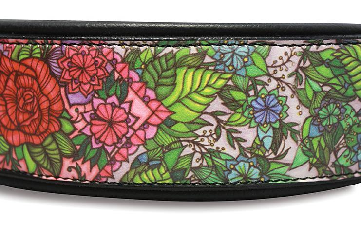 An Industry- first image transfer technology allows the artwork to be precisely mirrored onto the leather. The vivid colors and design are flawlessly captured from the original sketch. Made from 100% Genuine top grain Argentinean leather and soft padded leather bottom. Stainless steel hardware and a genuine brass buckle are used for the utmost in strength and durability. A generous layer of Resolene is applied to each collar before it is sold. Resolene is a clear sealant that protects the outer layer from the elements and prevents any fading.