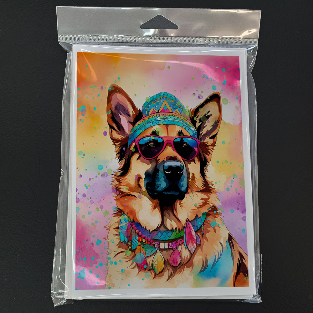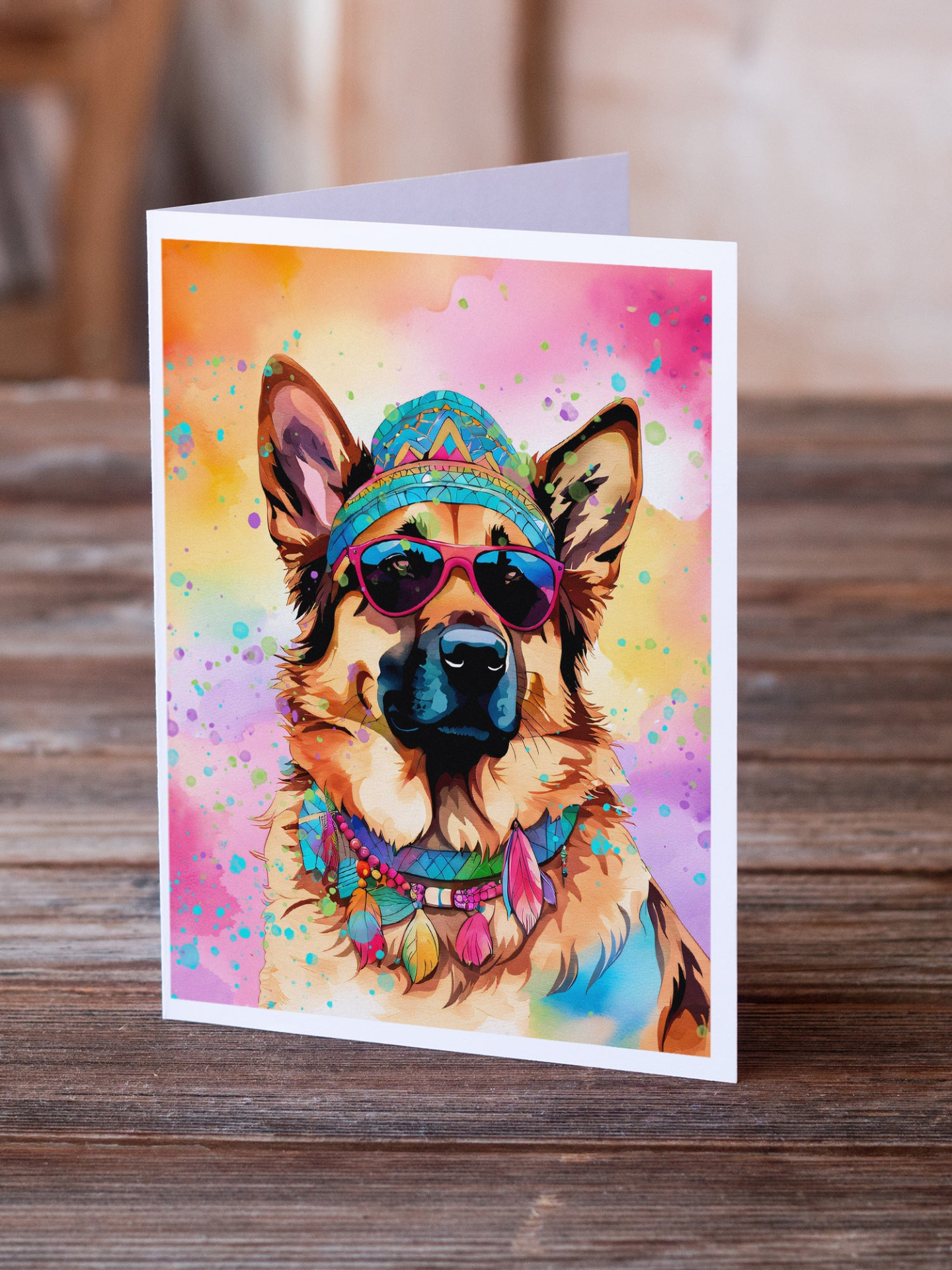 Greeting Cards Pack of 8 featuring breed specific German Shepherd artwork. Celebrate special moments with Caroline's Treasures Printed Greeting Card Pack. This pack includes eight beautifully folded 5x7 cards, accompanied by eight matching white envelopes. With blank interiors, these cards provide ample space for your personalized messages and heartfelt holiday greetings. Each card features captivating full-color artwork, meticulously printed in our facility on high-quality 80 lb cover stock or 216 GSM. The super smooth finish of the white cards enhances the visual impact of the artwork, creating a truly stunning presentation. Designed by our talented in-house artists or licensed artists, the artwork on these cards showcases their creativity and attention to detail. From vibrant illustrations to captivating designs, each card tells its own unique story. Whether it's for birthdays, anniversaries, holidays, or any special occasion, Caroline's Treasures Greeting Card Pack is the perfect way to convey your heartfelt sentiments. Share joy, love, and warm wishes with these exquisite cards and make every moment unforgettable.