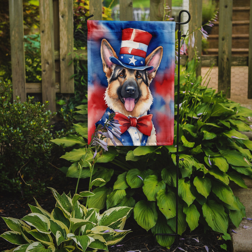 Garden Flag featuring breed specific German Shepherd artwork. Enhance the beauty of your garden, patio, or yard with Caroline's Treasures Decorative Garden Flag, proudly made in the USA. Crafted from two pieces of thick, double-sided polyester fabric, this 2-ply garden flag is designed to withstand various weather conditions, making it water-resistant and weatherproof. Featuring correctly readable words on both sides, this garden flag offers a delightful visual experience from any angle. With its heavier weight, it stands out among other garden flags, ensuring stability and durability even in wind, rain, and snow. Measuring approximately 11 1/4 inches by 15 1/2 inches, this flag allows you to personalize your outdoor decor. It comes with a 1 1/2-inch sleeve sewn in, allowing easy attachment to any standard garden flag stand or garden size porch hanger (sold separately). Make a statement in your outdoor space with Caroline's Treasures Decorative Garden Flag, a vibrant and high-quality flag that adds color and personality to your surroundings. Proudly made in the USA, it's a symbol of quality craftsmanship and attention to detail.