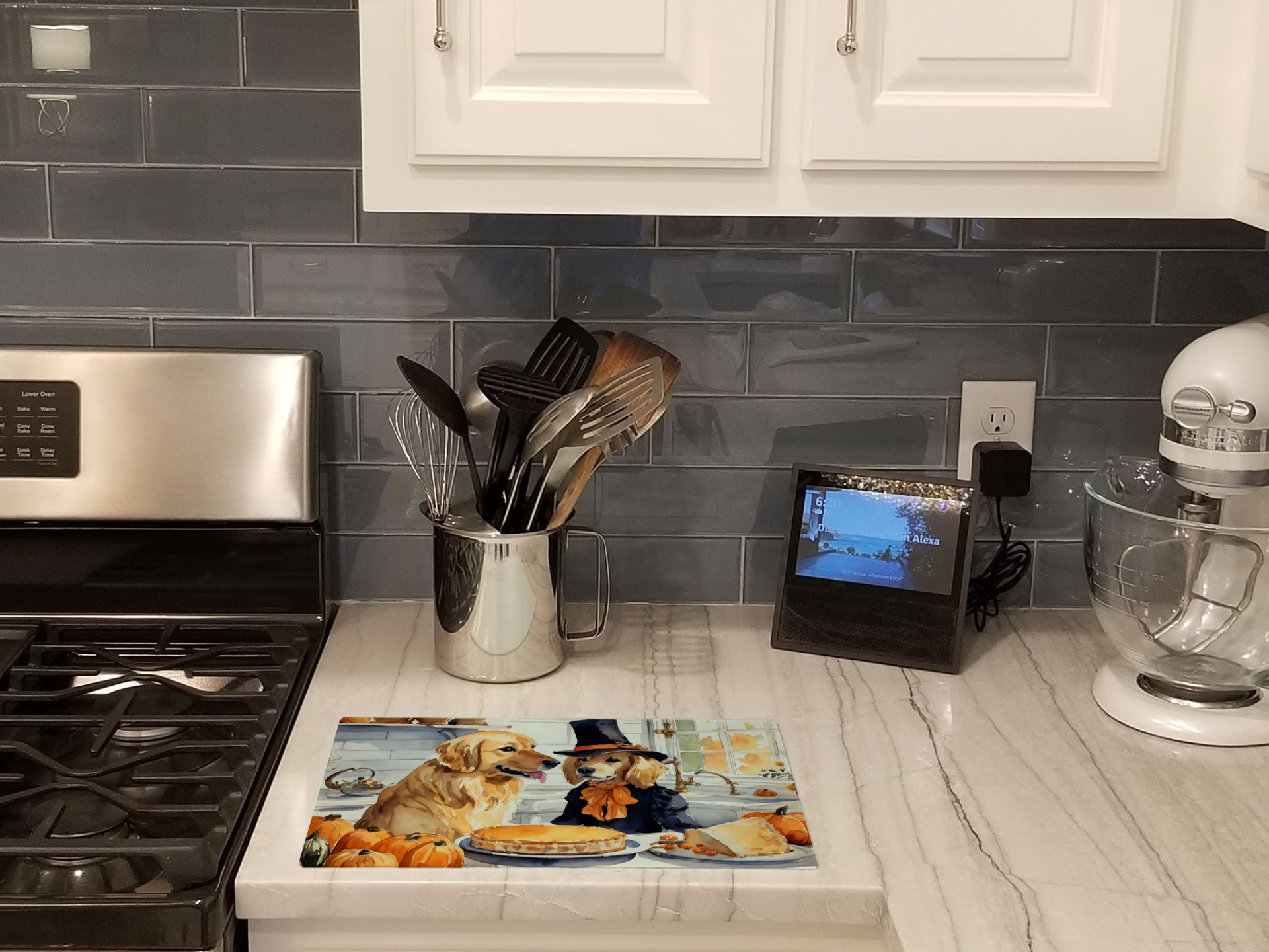 Glass Cutting Board featuring breed specific Golden Retriever artwork. Celebrate Halloween with this Halloween Cutting Board. Introduce your kitchen to the vibrant, large Decorative Glass Cutting Board from Caroline's Treasures. Crafted from resilient tempered glass, this board is not only a utilitarian necessity but also a colorful art piece. With its generous dimensions of 15 inches in height and 12 inches in length, it offers ample space for all your cutting needs. Every piece showcases captivating artwork from distinguished artists, bringing an aesthetic edge to your kitchen. Beyond its attractive design, this cutting board ensures your countertop stays pristine and unscathed, owing to its heat-resistant properties. Engineered with user convenience in mind, it features non-skid feet for stability, and rounded corners for additional safety. Its robust construction renders it virtually unbreakable, guaranteeing longevity. The board comes with protective feet bumpers, maintaining its position during use. This product is recommended to be hand washed only. Proudly printed and assembled in the United States, this cutting board exemplifies superior craftsmanship. With Caroline's Treasures' Decorative Glass Cutting Board, you're investing in a blend of functionality and artistic flair.