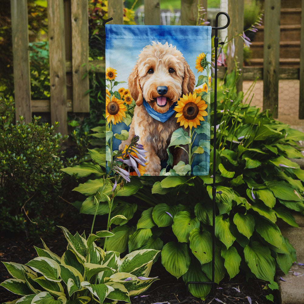 Garden Flag featuring breed specific Goldendoodle artwork. Enhance the beauty of your garden, patio, or yard with Caroline's Treasures Decorative Garden Flag, proudly made in the USA. Crafted from two pieces of thick, double-sided polyester fabric, this 2-ply garden flag is designed to withstand various weather conditions, making it water-resistant and weatherproof. Featuring correctly readable words on both sides, this garden flag offers a delightful visual experience from any angle. With its heavier weight, it stands out among other garden flags, ensuring stability and durability even in wind, rain, and snow. Measuring approximately 11 1/4 inches by 15 1/2 inches, this flag allows you to personalize your outdoor decor. It comes with a 1 1/2-inch sleeve sewn in, allowing easy attachment to any standard garden flag stand or garden size porch hanger (sold separately). Make a statement in your outdoor space with Caroline's Treasures Decorative Garden Flag, a vibrant and high-quality flag that adds color and personality to your surroundings. Proudly made in the USA, it's a symbol of quality craftsmanship and attention to detail.