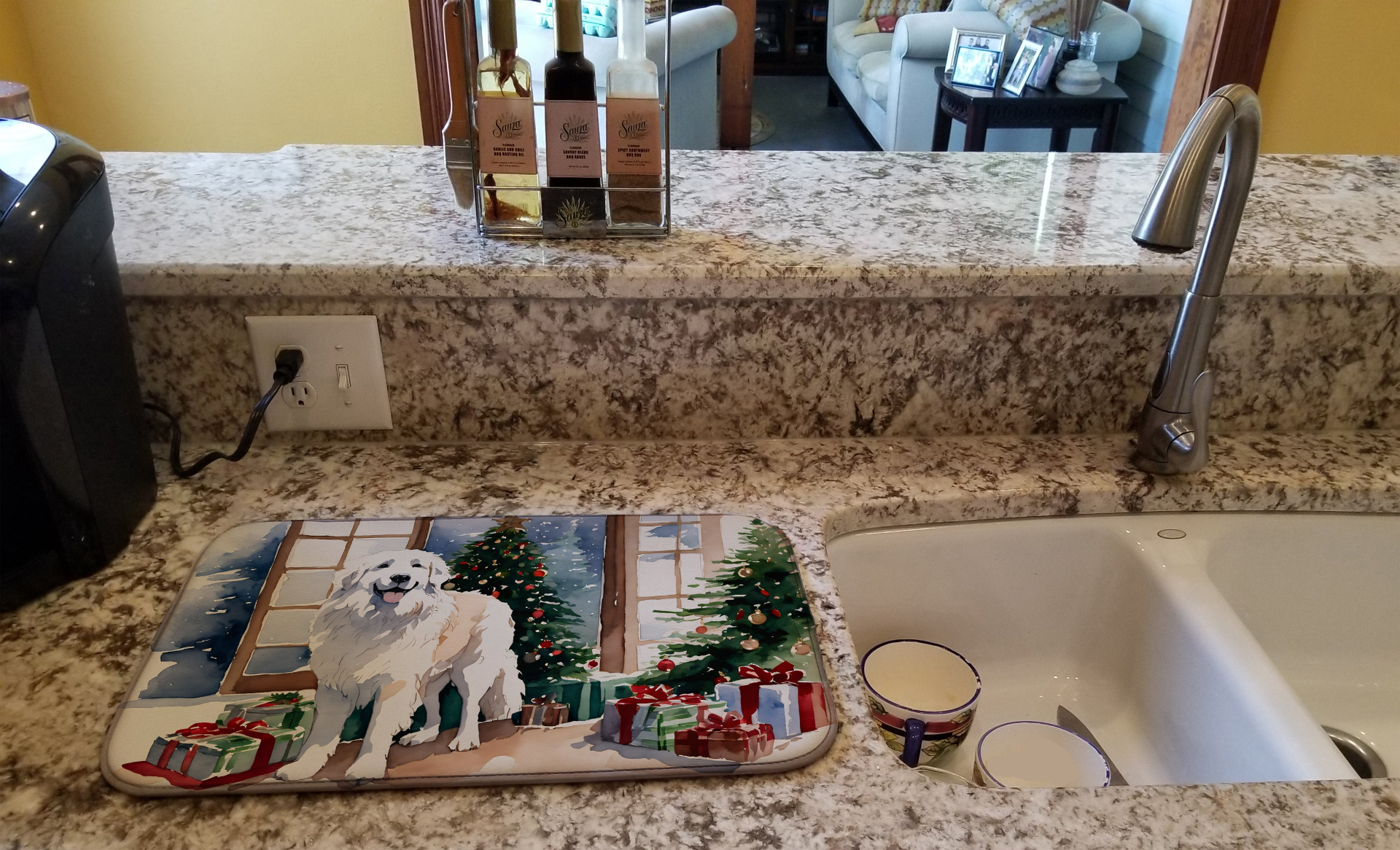 Dish Drying Mat featuring breed specific Great Pyrenees artwork. Celebrate Christmas with this Christmas Dish Drying Mat. Say goodbye to messy countertops and soggy dish towels with our innovative dish drying mat. Our high-quality dish drying pad is designed to keep your countertops dry while offering a stylish and efficient solution. Whether you're air drying dishes, glasses, stemware, silverware, pots, pans, bottles, or even fruits and vegetables, our dish mat is the perfect choice. The 14 inches x 22 inches size fits most counters and dish drying racks, and the non-slip design ensures stability. Made with water-absorbent polyester and a polyurethane foam insert, our dish drying mat is not only functional but also durable. It's machine washable and printed in the USA for long-lasting use. The beautiful artwork adds flair to your kitchen decor, making it a perfect housewarming gift or present for any occasion. Upgrade your kitchen experience with our absorbent and versatile dish drying mat.