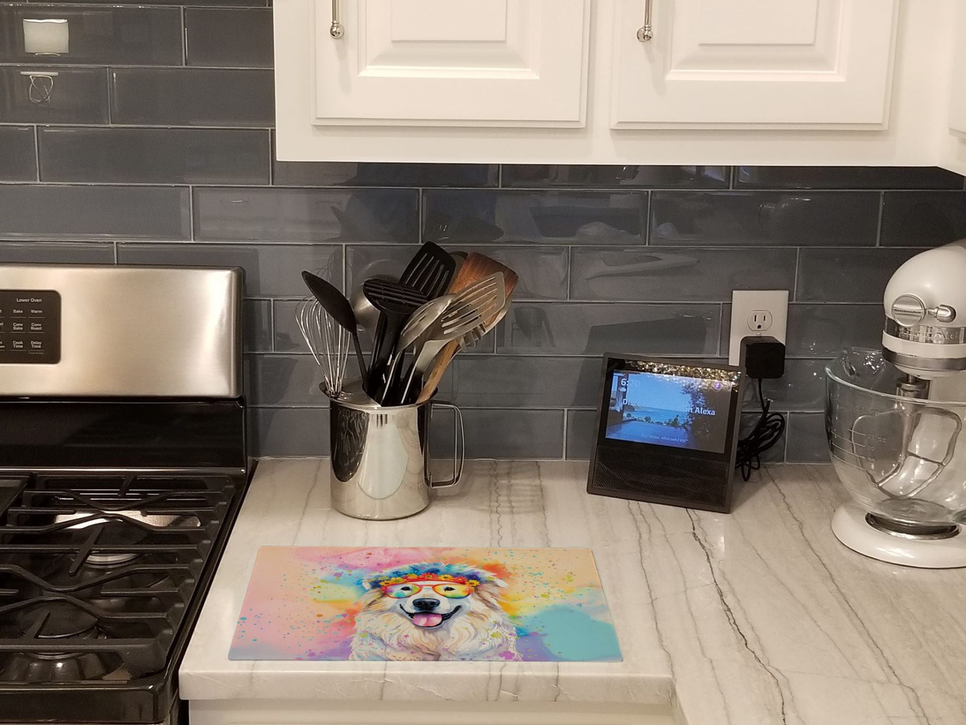Glass Cutting Board featuring breed specific Great Pyrenees artwork. Introduce your kitchen to the vibrant, large Decorative Glass Cutting Board from Caroline's Treasures. Crafted from resilient tempered glass, this board is not only a utilitarian necessity but also a colorful art piece. With its generous dimensions of 15 inches in height and 12 inches in length, it offers ample space for all your cutting needs. Every piece showcases captivating artwork from distinguished artists, bringing an aesthetic edge to your kitchen. Beyond its attractive design, this cutting board ensures your countertop stays pristine and unscathed, owing to its heat-resistant properties. Engineered with user convenience in mind, it features non-skid feet for stability, and rounded corners for additional safety. Its robust construction renders it virtually unbreakable, guaranteeing longevity. The board comes with protective feet bumpers, maintaining its position during use. This product is recommended to be hand washed only. Proudly printed and assembled in the United States, this cutting board exemplifies superior craftsmanship. With Caroline's Treasures' Decorative Glass Cutting Board, you're investing in a blend of functionality and artistic flair.