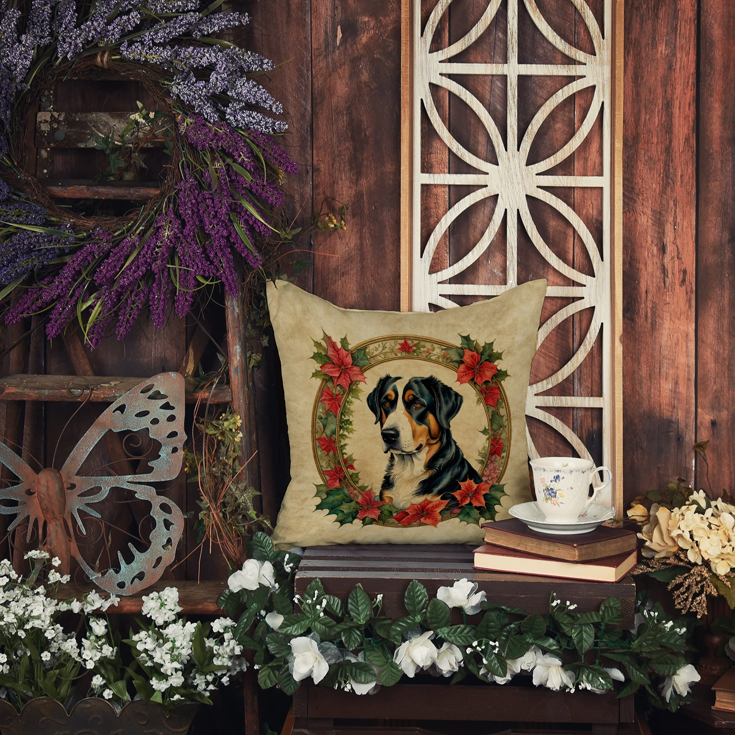 Throw Pillow featuring breed specific Greater Swiss Mountain Dog artwork. Celebrate Christmas with this Christmas Pillow. Revitalize your outdoor or indoor living space with Caroline's Treasures 18x18 Fabric Decorative Pillow. With a generously sized dimension of approximately 18 inches by 18 inches, this pillow makes a comfortable and aesthetic addition to any seating area. Made from a unique, water-resistant material developed by Caroline's Treasures, the pillow sham is 100% polyester fabric that's durable and ready to weather any condition. Its vibrant, full-color artwork will not fade over time as it is dyed with color-fast dyes. Whether you place it on your patio furniture, porch, veranda, or indoor couch, its soft canvas fabric ensures a cozy experience. The pillow is handcrafted in the United States, featuring a sham created from three pieces of fabric and a polyester insert for enduring shape and overstuffed comfort. Despite being robustly built to endure the outdoors, it is as soft and snug as your favorite indoor cushions. Please note, as all our pillows are handmade, sizes may vary slightly, adding to the charm of this unique decorative item.