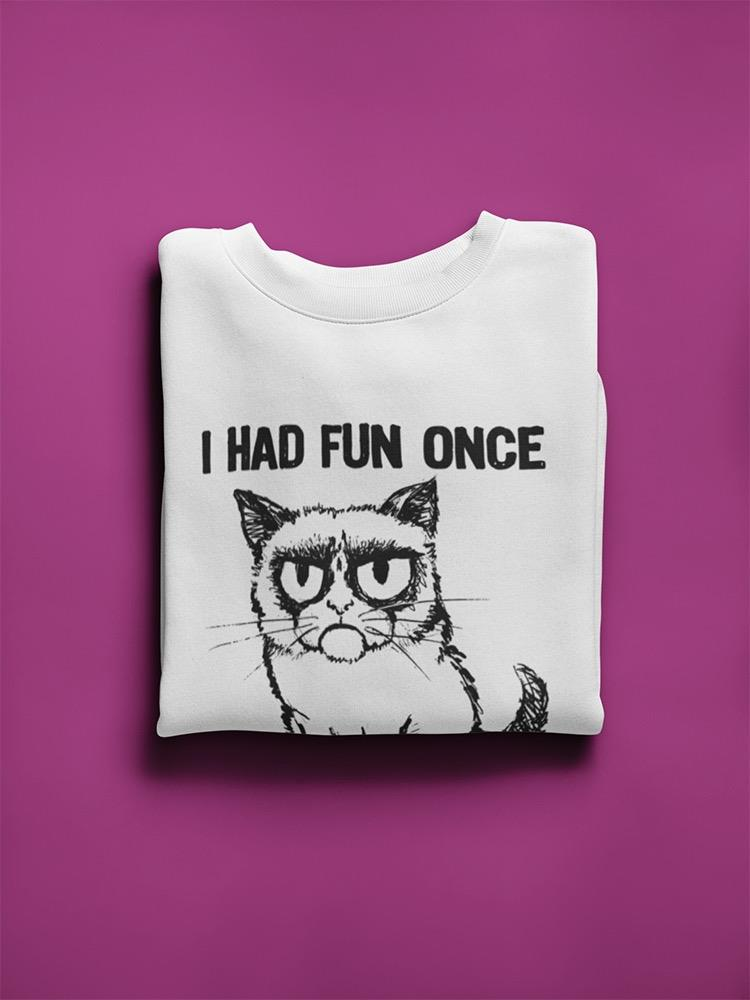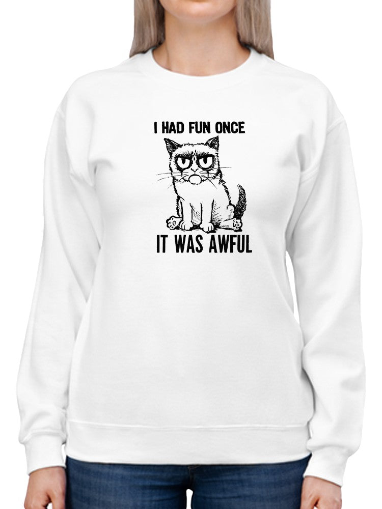 Look awesome in this design with the hand drawing cartoon of Grumpy Cat, seated and saying: i had fun once it was awful. Women's White Sweatshirt. Design by Grumpy Cat.