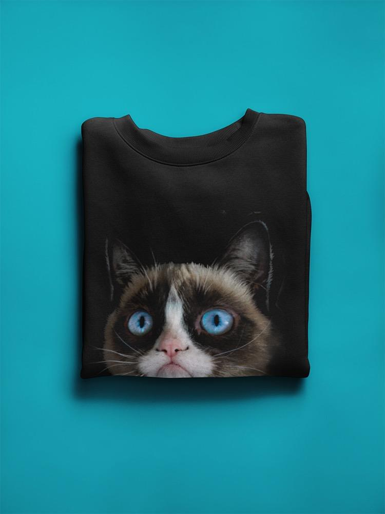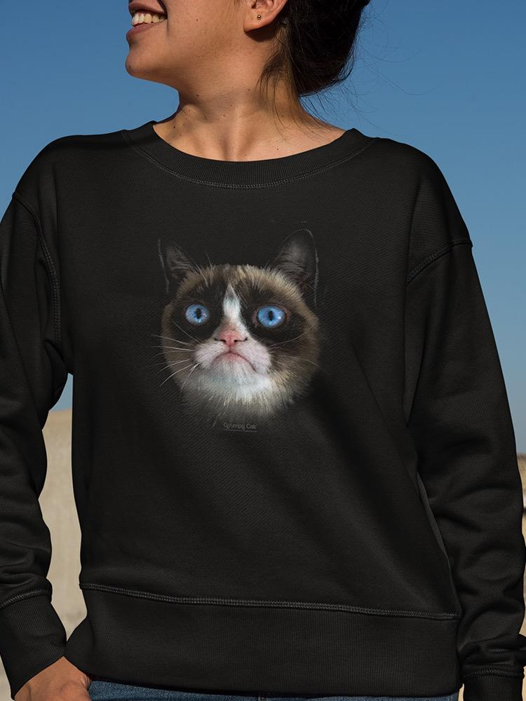 For the fans of Grumpy Cat. A design with a picture of the famous cat. Women's Black Sweatshirt. Design by Grumpy Cat.