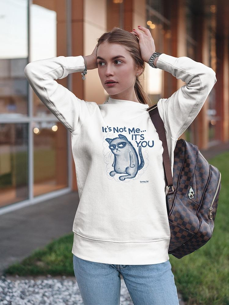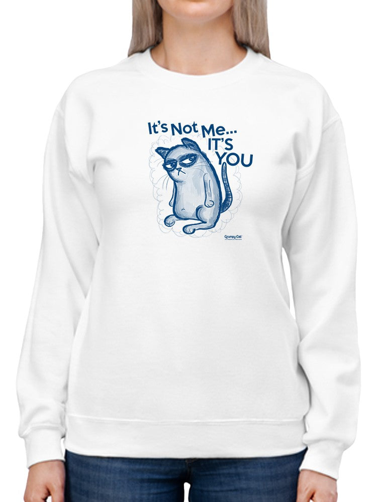 Look awesome in this design with the hand drawing cartoon of Grumpy Cat, seated and saying: it's not me its you. Women's White Sweatshirt. Design by Grumpy Cat.