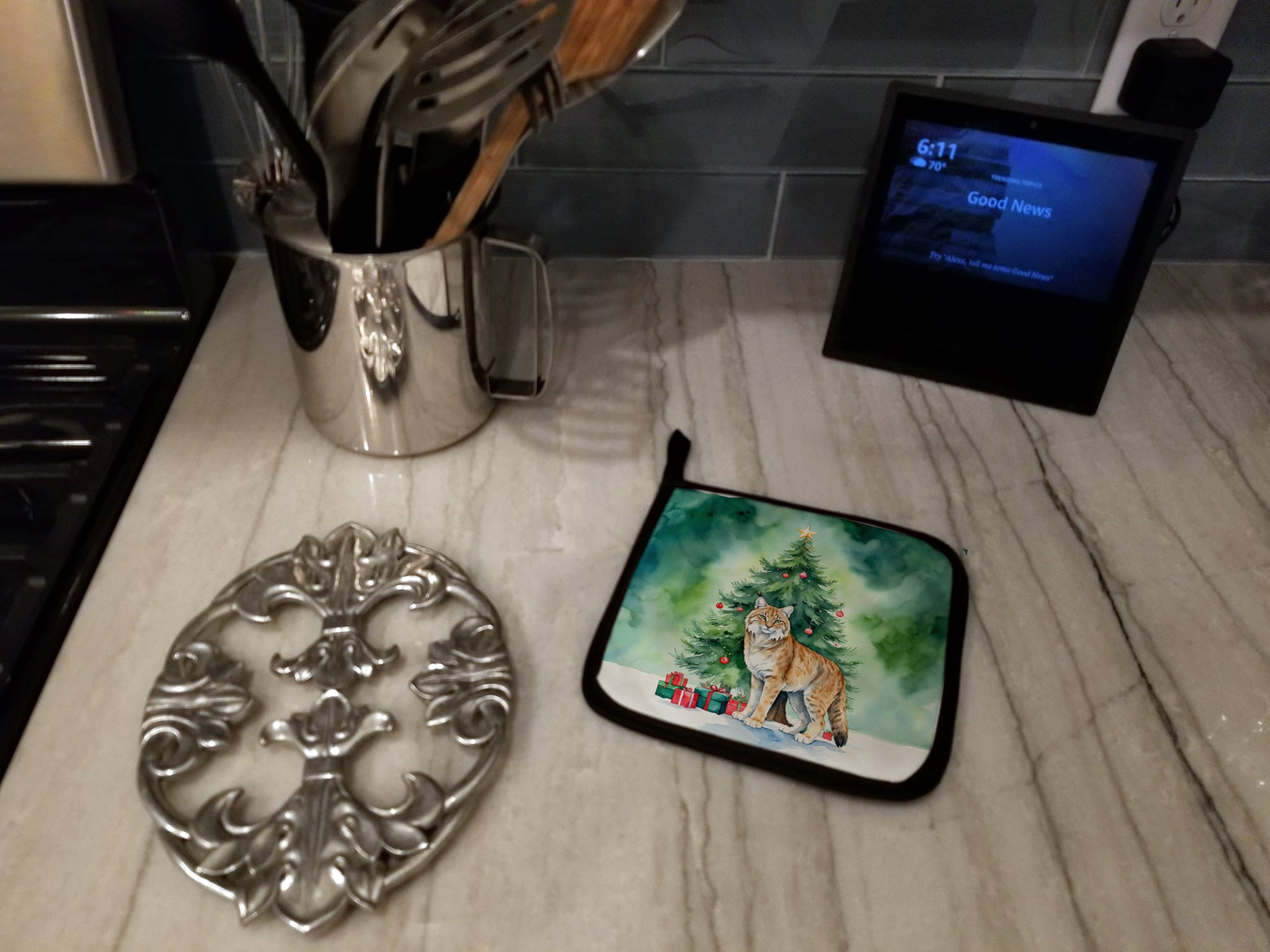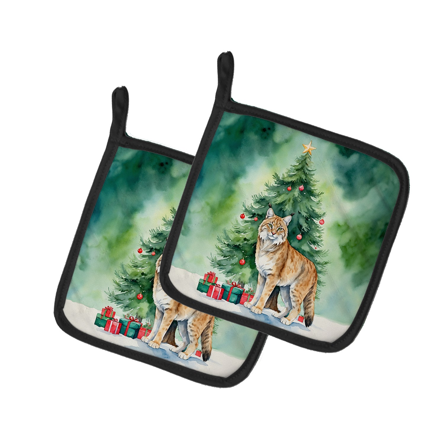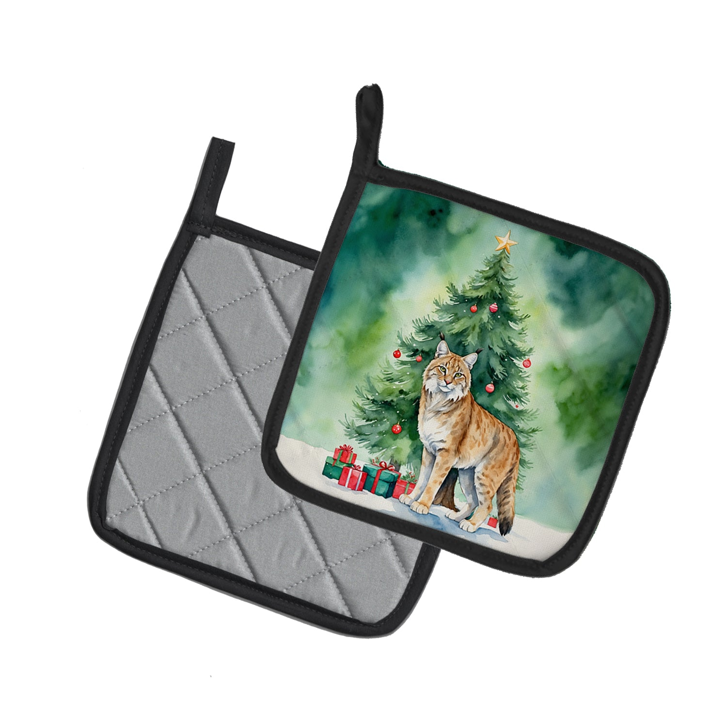 Highlander Lynx Cat By the Christmas Tree Pair of Pot Holders