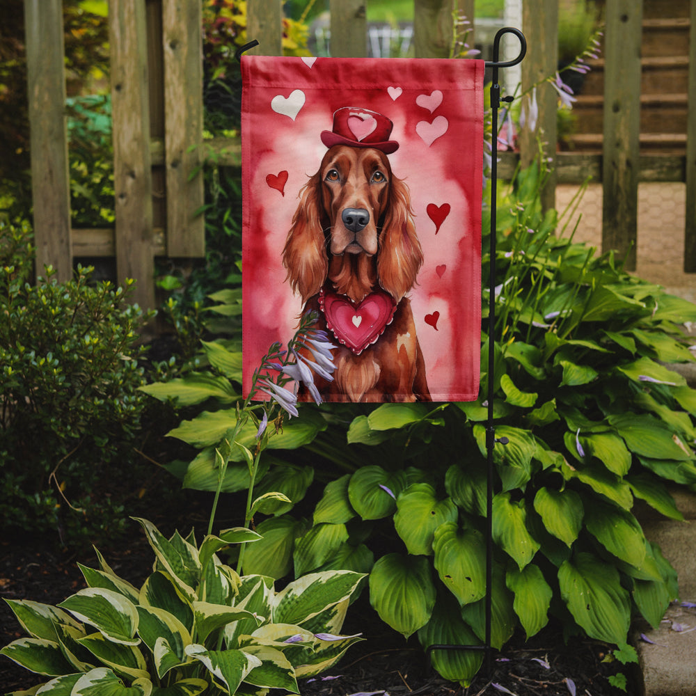 Garden Flag featuring breed specific Irish Setter artwork. Celebrate Valentine's Day with this Valentine's Day Garden Flag. Enhance the beauty of your garden, patio, or yard with Caroline's Treasures Decorative Garden Flag, proudly made in the USA. Crafted from two pieces of thick, double-sided polyester fabric, this 2-ply garden flag is designed to withstand various weather conditions, making it water-resistant and weatherproof. Featuring correctly readable words on both sides, this garden flag offers a delightful visual experience from any angle. With its heavier weight, it stands out among other garden flags, ensuring stability and durability even in wind, rain, and snow. Measuring approximately 11 1/4 inches by 15 1/2 inches, this flag allows you to personalize your outdoor decor. It comes with a 1 1/2-inch sleeve sewn in, allowing easy attachment to any standard garden flag stand or garden size porch hanger (sold separately). Make a statement in your outdoor space with Caroline's Treasures Decorative Garden Flag, a vibrant and high-quality flag that adds color and personality to your surroundings. Proudly made in the USA, it's a symbol of quality craftsmanship and attention to detail.