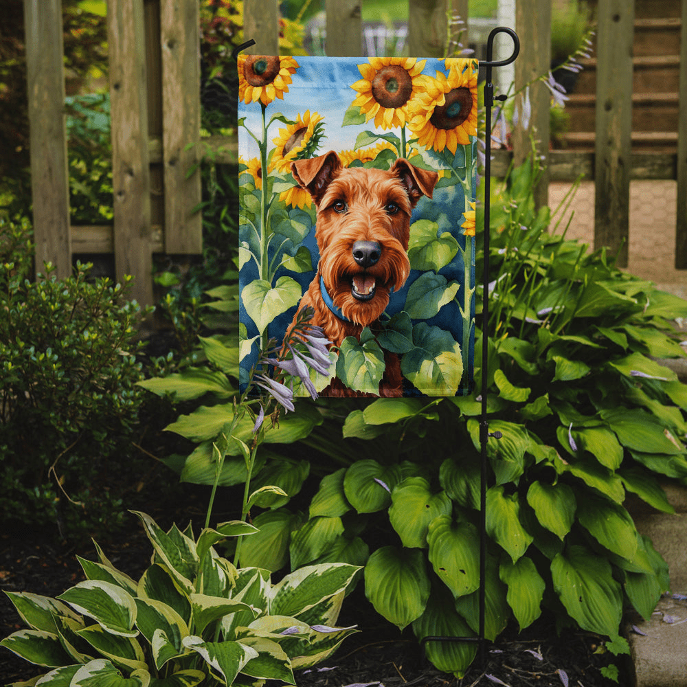 Irish Terrier in Sunflowers Garden Flag — Caroline's Treasures decorative garden flag, proudly made in the USA, featuring a breed-specific Irish Terrier artwork set among bright sunflowers to elevate your outdoor space.