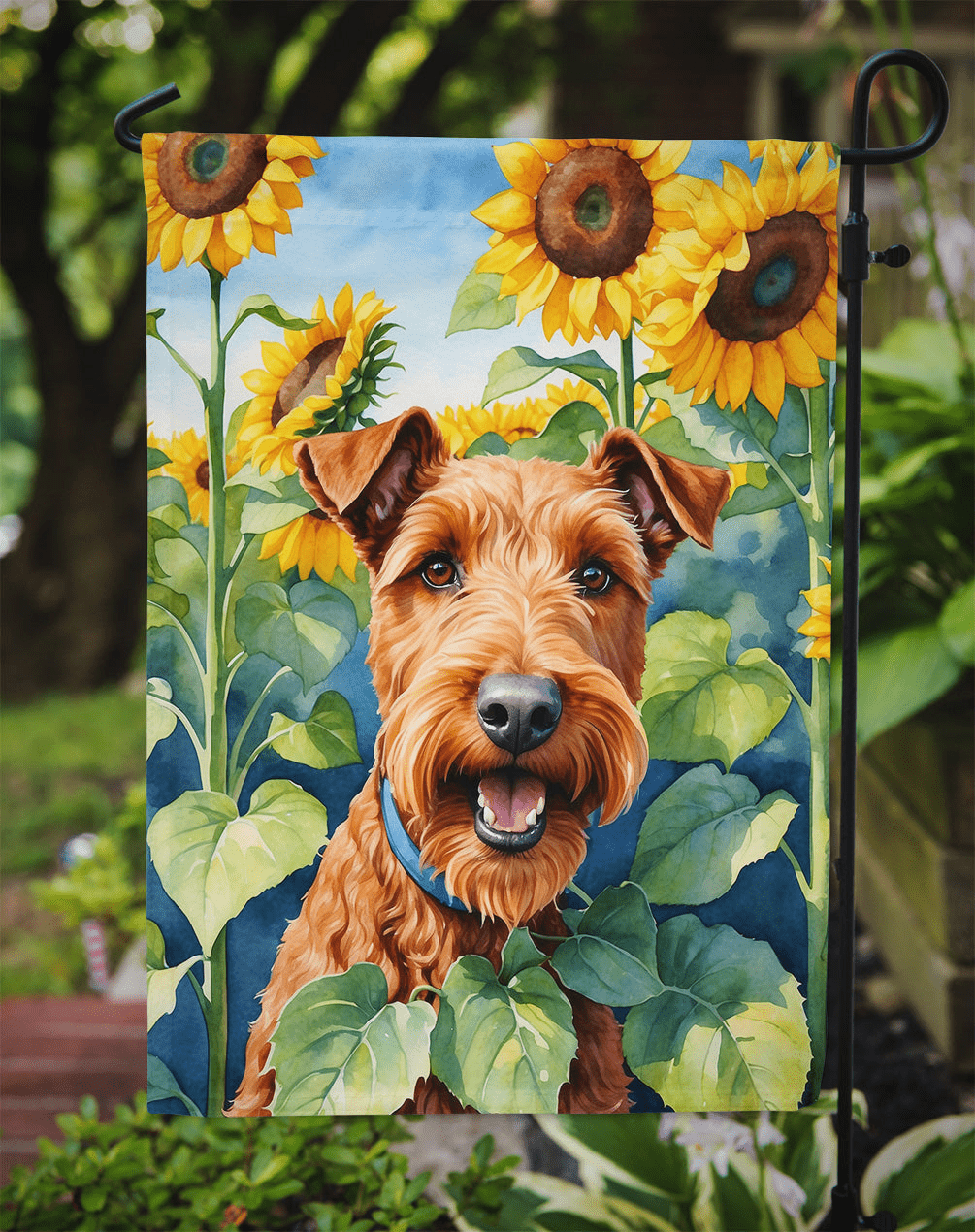 - Design: Irish Terrier artwork with sunflowers; readable from both sides.