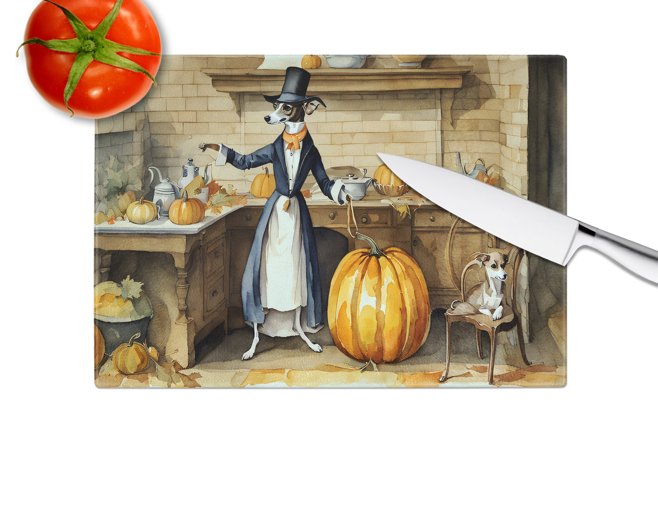 Glass Cutting Board featuring breed specific Italian Greyhound artwork. Celebrate Halloween with this Halloween Cutting Board. Introduce your kitchen to the vibrant, large Decorative Glass Cutting Board from Caroline's Treasures. Crafted from resilient tempered glass, this board is not only a utilitarian necessity but also a colorful art piece. With its generous dimensions of 15 inches in height and 12 inches in length, it offers ample space for all your cutting needs. Every piece showcases captivating artwork from distinguished artists, bringing an aesthetic edge to your kitchen. Beyond its attractive design, this cutting board ensures your countertop stays pristine and unscathed, owing to its heat-resistant properties. Engineered with user convenience in mind, it features non-skid feet for stability, and rounded corners for additional safety. Its robust construction renders it virtually unbreakable, guaranteeing longevity. The board comes with protective feet bumpers, maintaining its position during use. This product is recommended to be hand washed only. Proudly printed and assembled in the United States, this cutting board exemplifies superior craftsmanship. With Caroline's Treasures' Decorative Glass Cutting Board, you're investing in a blend of functionality and artistic flair.