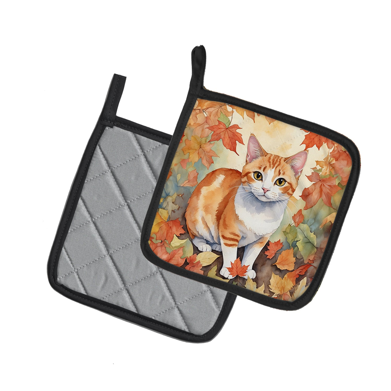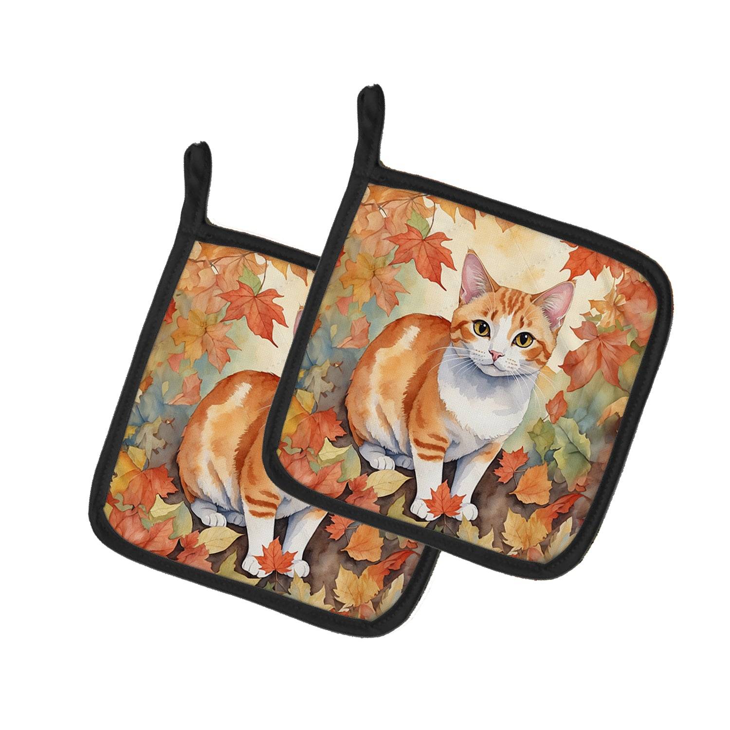 Japanese Bobtail Cat in Fall Leaves Pair of Pot Holders