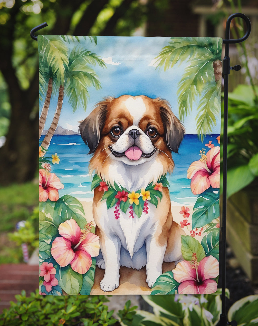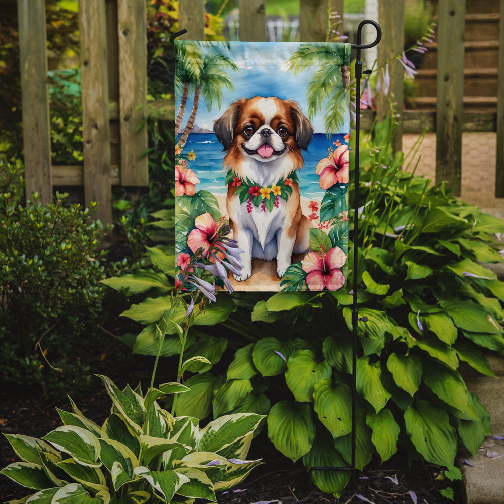 Garden Flag featuring breed specific Japanese Chin artwork. Enhance the beauty of your garden, patio, or yard with Caroline's Treasures Decorative Garden Flag, proudly made in the USA. Crafted from two pieces of thick, double-sided polyester fabric, this 2-ply garden flag is designed to withstand various weather conditions, making it water-resistant and weatherproof. Featuring correctly readable words on both sides, this garden flag offers a delightful visual experience from any angle. With its heavier weight, it stands out among other garden flags, ensuring stability and durability even in wind, rain, and snow. Measuring approximately 11 1/4 inches by 15 1/2 inches, this flag allows you to personalize your outdoor decor. It comes with a 1 1/2-inch sleeve sewn in, allowing easy attachment to any standard garden flag stand or garden size porch hanger (sold separately). Make a statement in your outdoor space with Caroline's Treasures Decorative Garden Flag, a vibrant and high-quality flag that adds color and personality to your surroundings. Proudly made in the USA, it's a symbol of quality craftsmanship and attention to detail.