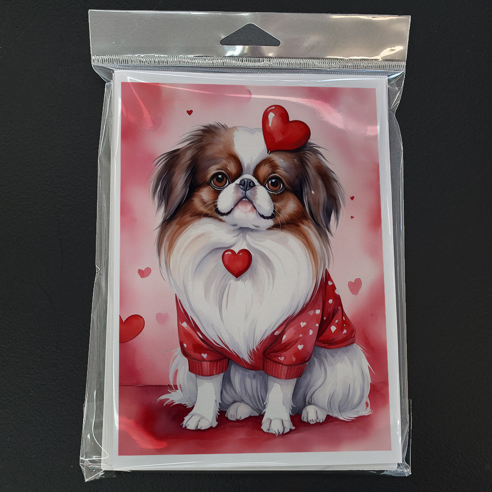 Greeting Cards Pack of 8 featuring breed specific Japanese Chin artwork. Celebrate Valentine's Day with this Valentine's Day . Celebrate special moments with Caroline's Treasures Printed Greeting Card Pack. This pack includes eight beautifully folded 5x7 cards, accompanied by eight matching white envelopes. With blank interiors, these cards provide ample space for your personalized messages and heartfelt holiday greetings. Each card features captivating full-color artwork, meticulously printed in our facility on high-quality 80 lb cover stock or 216 GSM. The super smooth finish of the white cards enhances the visual impact of the artwork, creating a truly stunning presentation. Designed by our talented in-house artists or licensed artists, the artwork on these cards showcases their creativity and attention to detail. From vibrant illustrations to captivating designs, each card tells its own unique story. Whether it's for birthdays, anniversaries, holidays, or any special occasion, Caroline's Treasures Greeting Card Pack is the perfect way to convey your heartfelt sentiments. Share joy, love, and warm wishes with these exquisite cards and make every moment unforgettable.