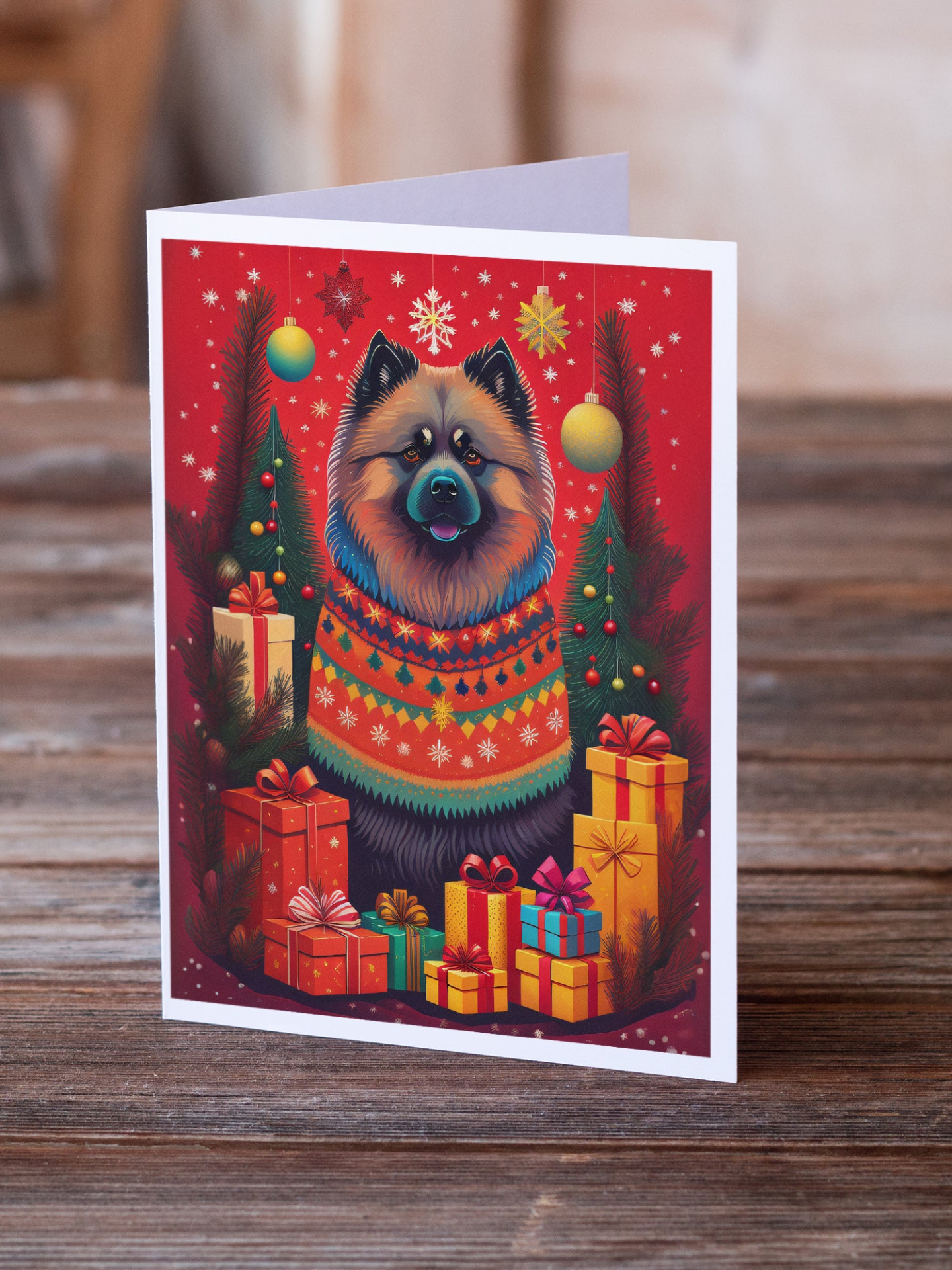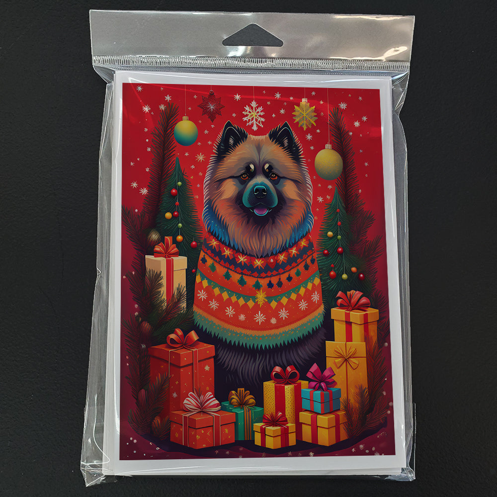 Greeting Cards Pack of 8 featuring breed specific Keeshond artwork. Celebrate Christmas with this Christmas . Celebrate special moments with Caroline's Treasures Printed Greeting Card Pack. This pack includes eight beautifully folded 5x7 cards, accompanied by eight matching white envelopes. With blank interiors, these cards provide ample space for your personalized messages and heartfelt holiday greetings. Each card features captivating full-color artwork, meticulously printed in our facility on high-quality 80 lb cover stock or 216 GSM. The super smooth finish of the white cards enhances the visual impact of the artwork, creating a truly stunning presentation. Designed by our talented in-house artists or licensed artists, the artwork on these cards showcases their creativity and attention to detail. From vibrant illustrations to captivating designs, each card tells its own unique story. Whether it's for birthdays, anniversaries, holidays, or any special occasion, Caroline's Treasures Greeting Card Pack is the perfect way to convey your heartfelt sentiments. Share joy, love, and warm wishes with these exquisite cards and make every moment unforgettable.