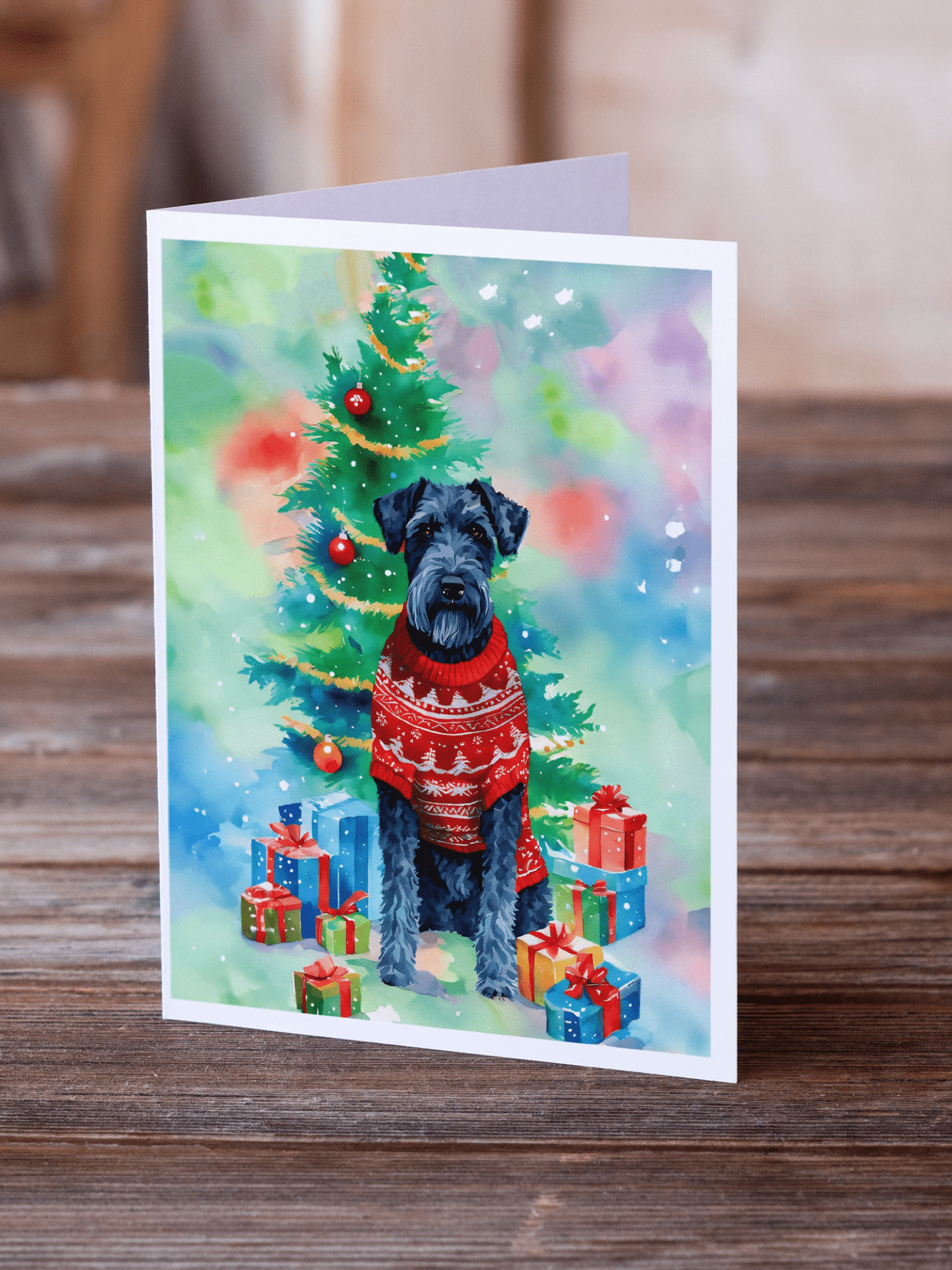 Celebrate the season with a touch of Kerry Blue Terrier charm. This set of eight beautifully folded 5x7 greeting cards brings luxury to your holiday notes, with blank interiors for your personal messages. Printed on premium stock with vibrant, full-color artwork by our in-house or licensed artists, these cards feel as special as the moments you’re celebrating and will make your greetings memorable.