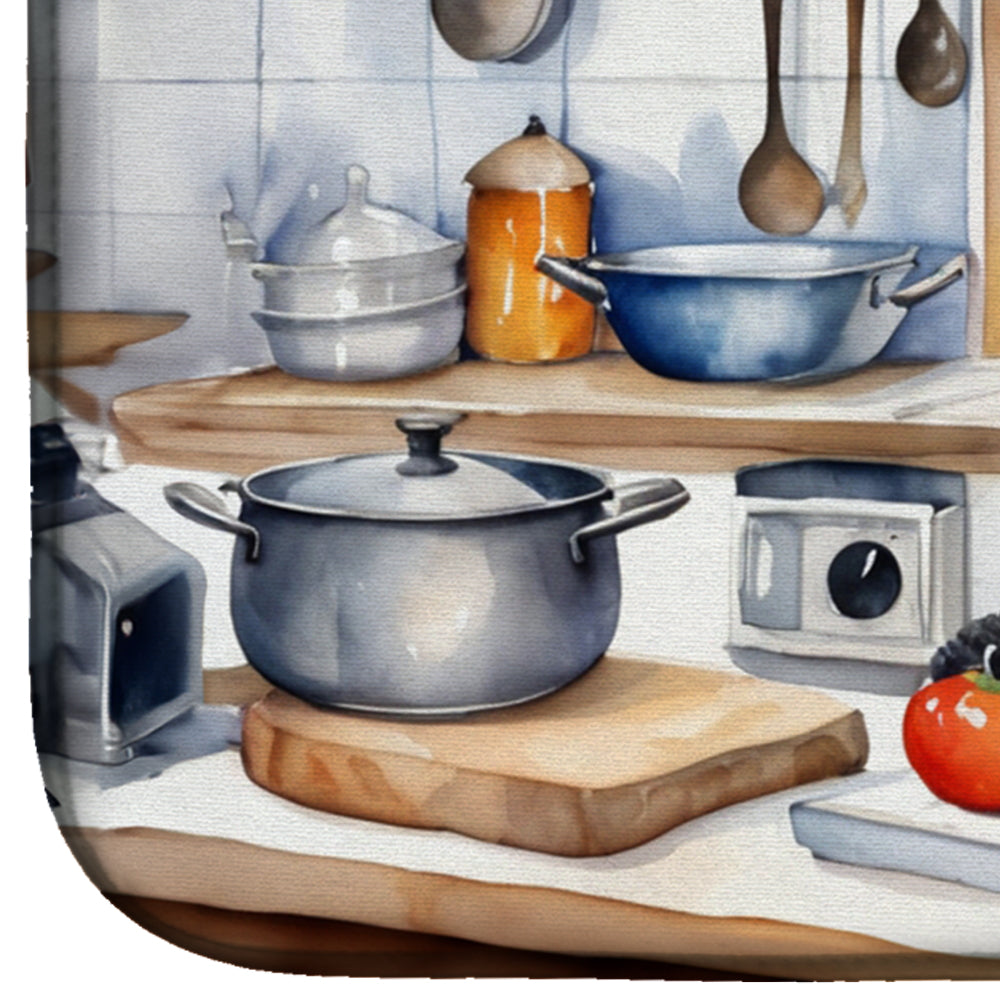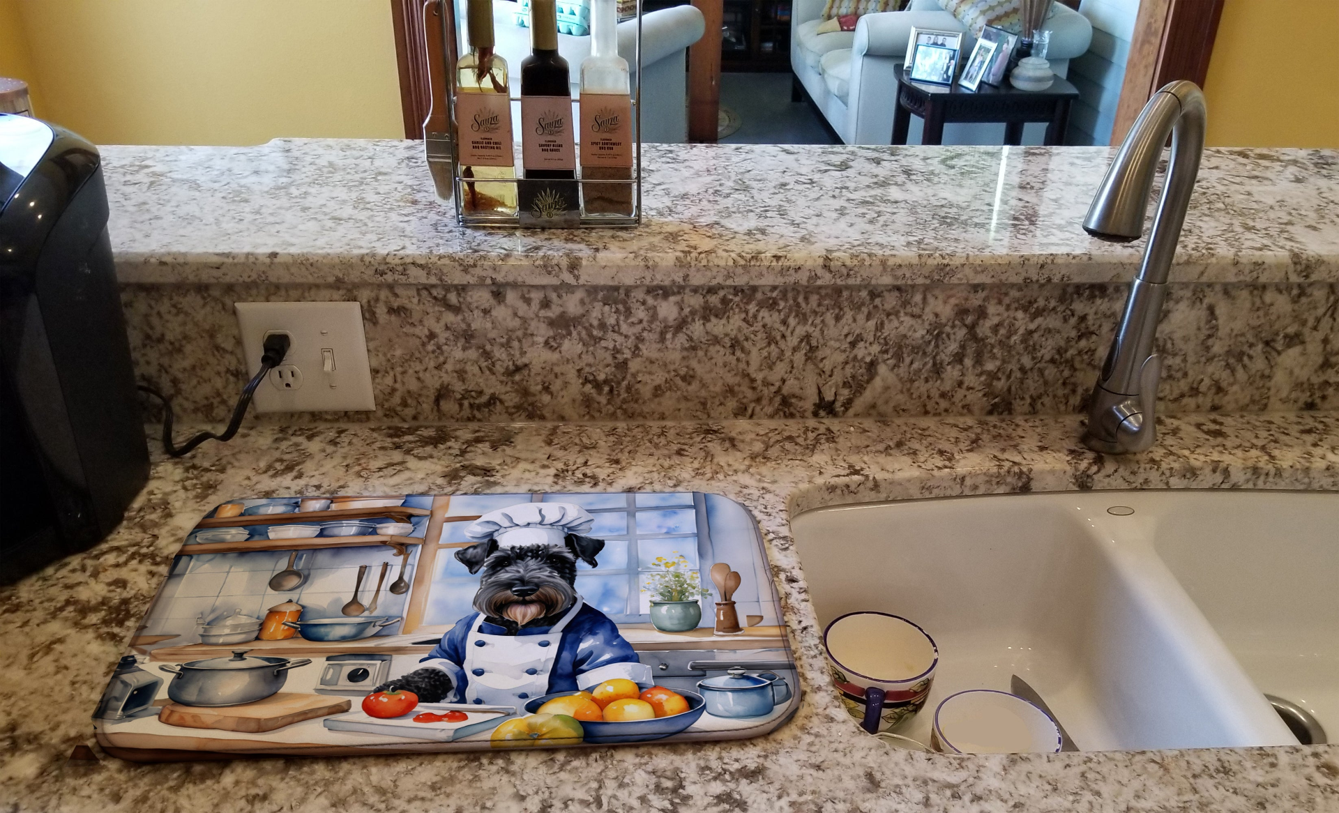 Dish Drying Mat featuring breed specific Kerry Blue Terrier artwork. Say goodbye to messy countertops and soggy dish towels with our innovative dish drying mat. Our high-quality dish drying pad is designed to keep your countertops dry while offering a stylish and efficient solution. Whether you're air drying dishes, glasses, stemware, silverware, pots, pans, bottles, or even fruits and vegetables, our dish mat is the perfect choice. The 14 inches x 22 inches size fits most counters and dish drying racks, and the non-slip design ensures stability. Made with water-absorbent polyester and a polyurethane foam insert, our dish drying mat is not only functional but also durable. It's machine washable and printed in the USA for long-lasting use. The beautiful artwork adds flair to your kitchen decor, making it a perfect housewarming gift or present for any occasion. Upgrade your kitchen experience with our absorbent and versatile dish drying mat.