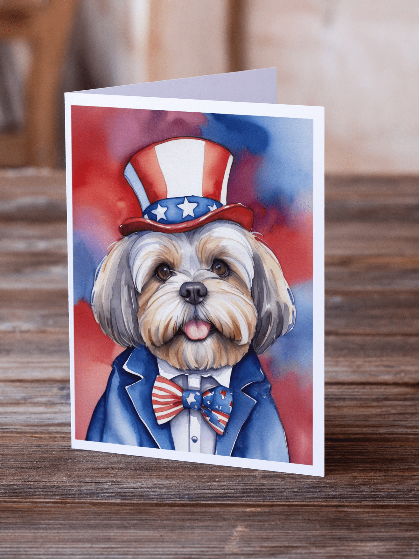 - Eight foldable 5x7 greeting cards featuring breed-specific Lhasa Apso patriotic artwork
