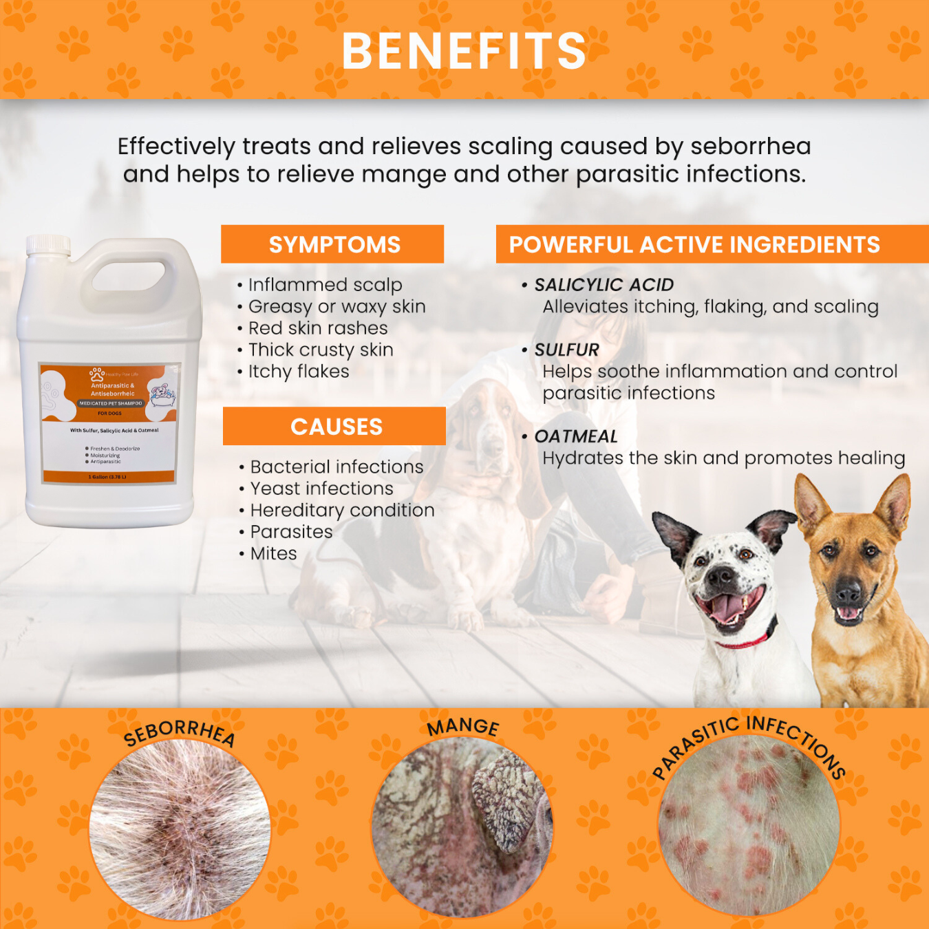 Your wait is over. This is your pet’s favourite medicated shampoo. Healthy Paw Life's medicated shampoo combines the power of sulfur, salicylic acid and oatmeal to help with skin scaling caused by seborrhea, mange and parasitic infections as well as non-specific dermatoses If you don’t see any fleas, your pet may be struggling with non-specific dermatoses. When left untreated, the problem could last for months, leaving your pet in great discomfort. He could end up losing patches of fur! In these cases, even veterinary-prescribed treatments can fall short. Healthy Paw Life's Medicated Shampoo offers a safe, gentle but powerful relief for your furry pal.