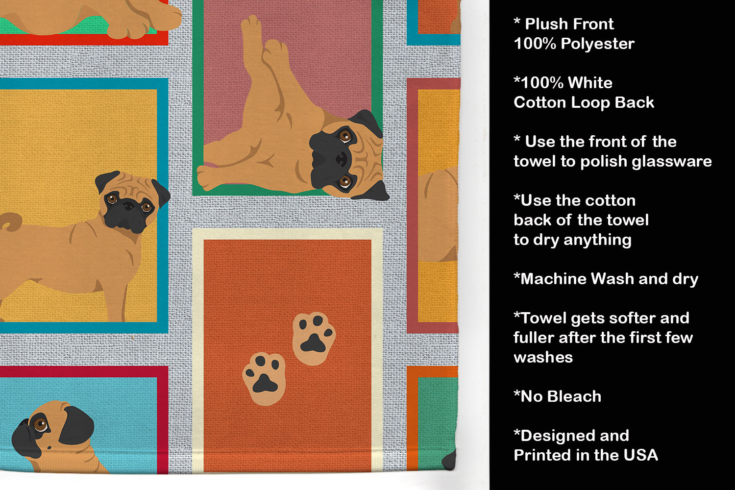 Kitchen Towel featuring breed specific Pug artwork. Experience the perfect blend of aesthetic appeal and functional excellence with our Plush Velour Kitchen Towels. These are not your ordinary decorative kitchen towels that gather dust. Instead, they are designed to be as practical as they are stylish. The front layer of our towel is constructed from a minky plush polyester, known for its durability and color retention. Unlike conventional kitchen towels, the artwork on our towels is dyed directly into the fabric, ensuring vibrant colors that last. Polish your glassware to a brilliant sparkle using the plush front side of the towel. Flip to the back, crafted from 100% cotton terry loop, to exploit its exceptional absorbency for drying dishes or wiping down counters. Our kitchen towels redefine the concept of functional art, offering lasting quality that maintains the towel's shape over time. Measuring 15 inches by 25 inches and weighing 2.3 lbs per dozen, these towels deliver an overwhelming sensory experience with their soft, plush, and smooth texture. The edges are meticulously finished with binding, enhancing their durability and visual appeal. For your convenience, these towels are machine washable and can be dried on low heat. After the first wash, the top fabric becomes even softer and fluffier, eliminating the need for ironing. Treat your kitchen to the luxury and functionality it deserves with our plush velour kitchen towels.