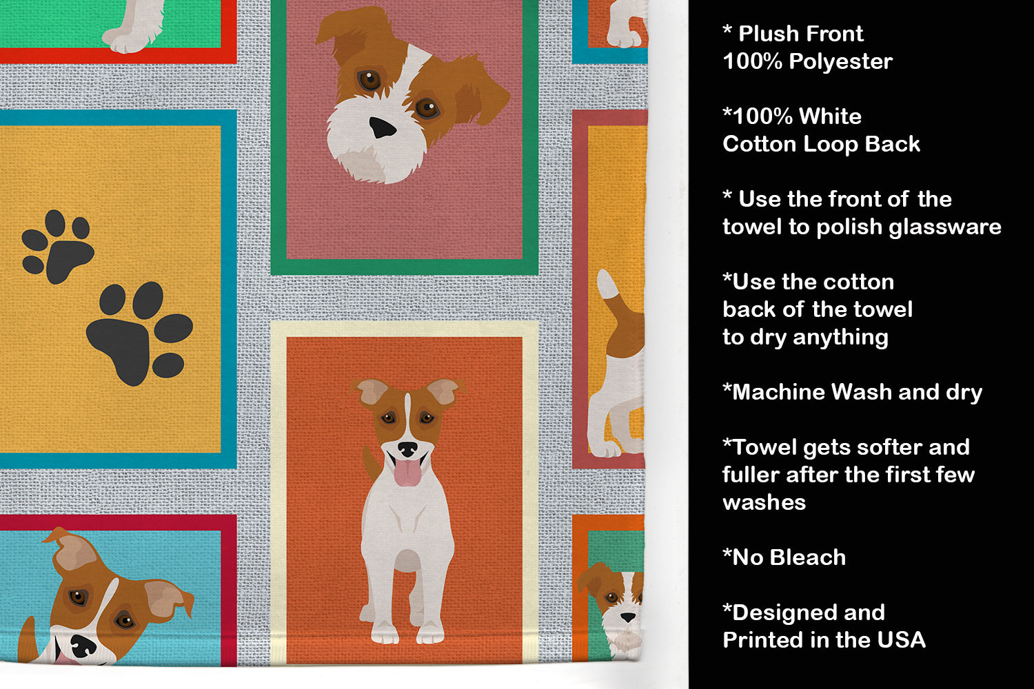 Kitchen Towel featuring breed specific Jack Russell Terrier artwork. Experience the perfect blend of aesthetic appeal and functional excellence with our Plush Velour Kitchen Towels. These are not your ordinary decorative kitchen towels that gather dust. Instead, they are designed to be as practical as they are stylish. The front layer of our towel is constructed from a minky plush polyester, known for its durability and color retention. Unlike conventional kitchen towels, the artwork on our towels is dyed directly into the fabric, ensuring vibrant colors that last. Polish your glassware to a brilliant sparkle using the plush front side of the towel. Flip to the back, crafted from 100% cotton terry loop, to exploit its exceptional absorbency for drying dishes or wiping down counters. Our kitchen towels redefine the concept of functional art, offering lasting quality that maintains the towel's shape over time. Measuring 15 inches by 25 inches and weighing 2.3 lbs per dozen, these towels deliver an overwhelming sensory experience with their soft, plush, and smooth texture. The edges are meticulously finished with binding, enhancing their durability and visual appeal. For your convenience, these towels are machine washable and can be dried on low heat. After the first wash, the top fabric becomes even softer and fluffier, eliminating the need for ironing. Treat your kitchen to the luxury and functionality it deserves with our plush velour kitchen towels.