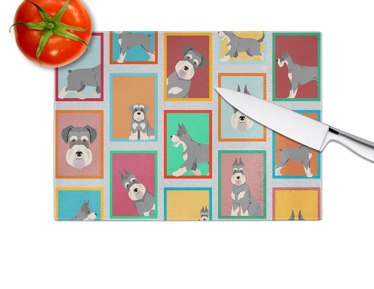 Glass Cutting Board featuring breed specific Schnauzer artwork. Introduce your kitchen to the vibrant, large Decorative Glass Cutting Board from Caroline's Treasures. Crafted from resilient tempered glass, this board is not only a utilitarian necessity but also a colorful art piece. With its generous dimensions of 15 inches in height and 12 inches in length, it offers ample space for all your cutting needs. Every piece showcases captivating artwork from distinguished artists, bringing an aesthetic edge to your kitchen. Beyond its attractive design, this cutting board ensures your countertop stays pristine and unscathed, owing to its heat-resistant properties. Engineered with user convenience in mind, it features non-skid feet for stability, and rounded corners for additional safety. Its robust construction renders it virtually unbreakable, guaranteeing longevity. The board comes with protective feet bumpers, maintaining its position during use. This product is recommended to be hand washed only. Proudly printed and assembled in the United States, this cutting board exemplifies superior craftsmanship. With Caroline's Treasures' Decorative Glass Cutting Board, you're investing in a blend of functionality and artistic flair.