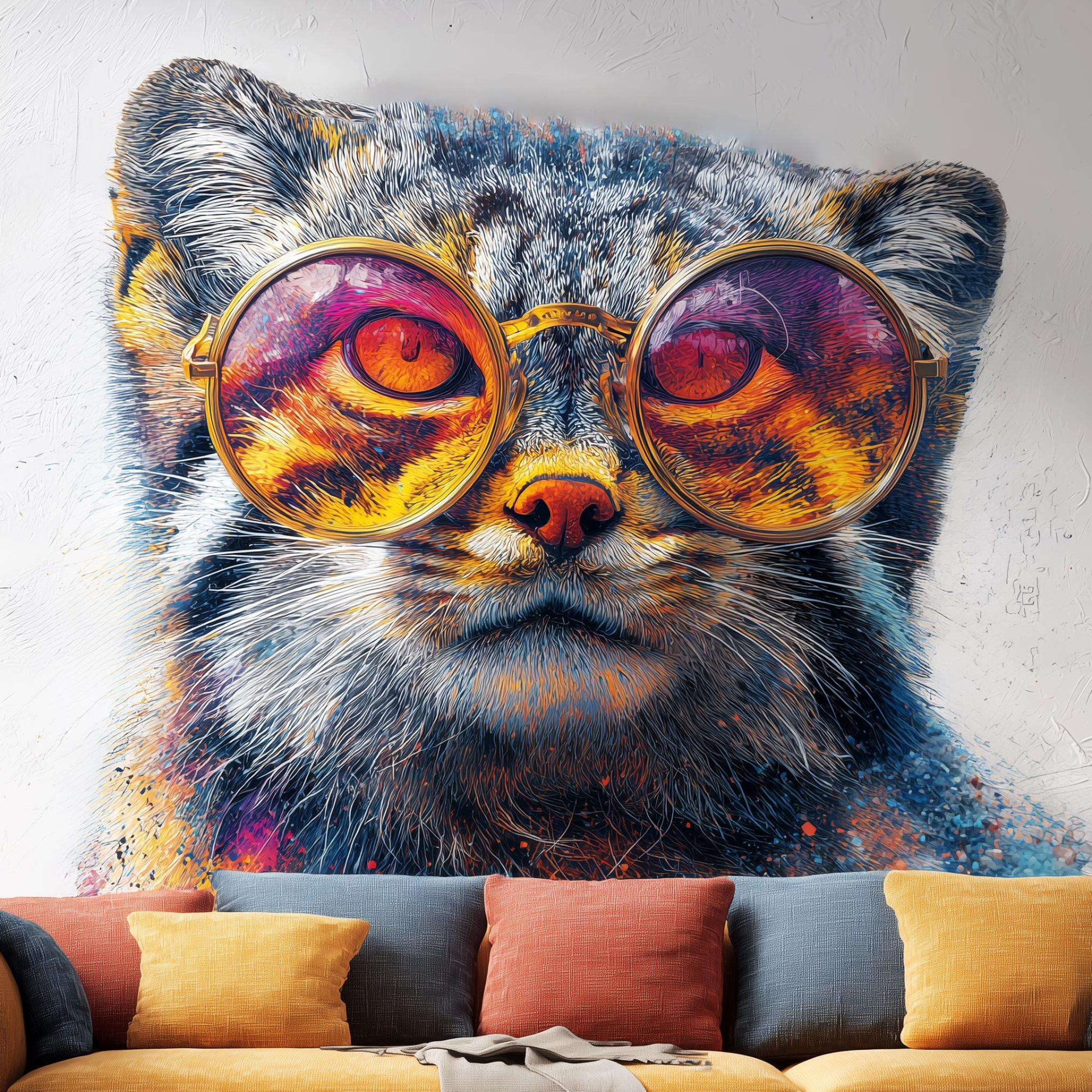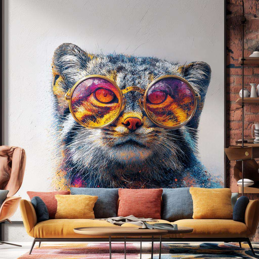 Make a bold statement with this unique wall decal featuring a Pallas’s cat (Manul) in vibrant sunglasses. The intense gaze, combined with the colorful reflective glasses, brings a playful yet wild edge to any modern space.