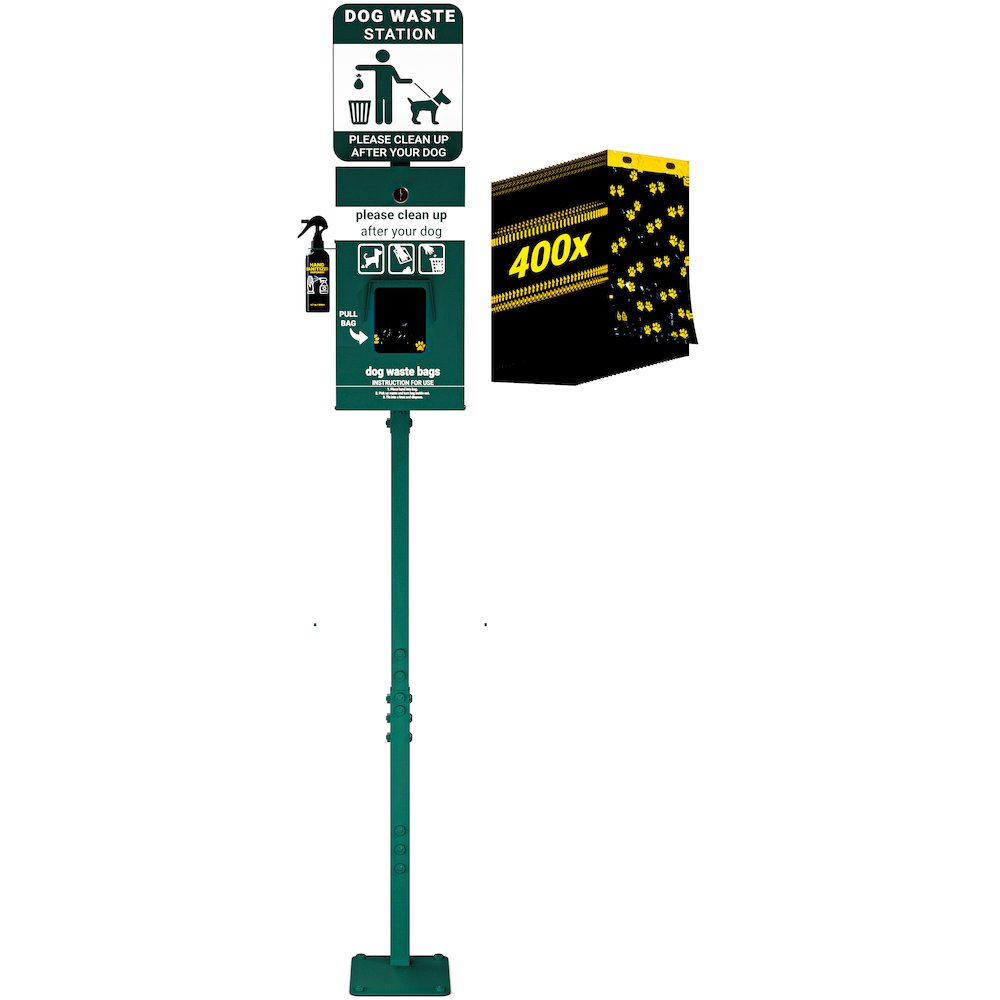 Daily walks are a great source of fun and exercise for owners and beloved pets alike, but it can lead to unplanned stops along your favorite walking routes when mother nature calls. Give pet owners everything they need to leave your neighborhood, dog park, or public walking trails as clean as they found them when you install this mini pet waste station. From leakproof rolls of pet waste bags to a hand sanitizer bottle, this set makes pickup and disposal of pet waste less of a chore Made from rust-resistant galvanized steel, this waste station is ideal for any outdoor areas where pet owners congregate. The glow in the dark signage is highly visible both day and night and in less than perfect weather. The locking bag dispenser holds lots of pull out header bags and boasts a rain guard to keep waste bags dry. Last but not least, the nifty hand sanitizer bottle is readily available after the pickup work is done so pet owners are free to continue on their way with no lingering germs or odors. Assembly is quick and easy with the include step-by-step instructions and cleanup is achieved with a damp cloth. For safety and stability, it is recommended that you anchor the pet waste station onto a cement base pad in the ground using the included expansion screws and an air hammer (not included). For your convenience, we have included 400 waste bags to get you started.