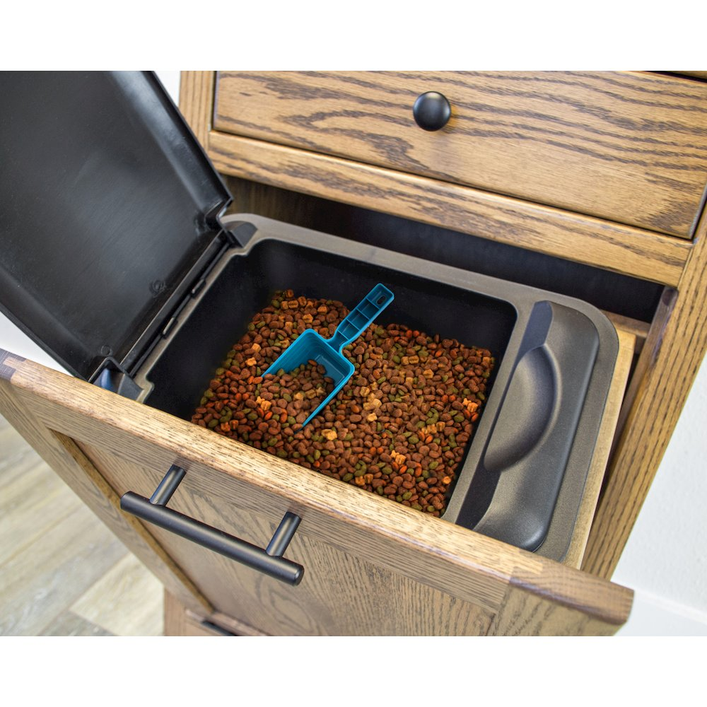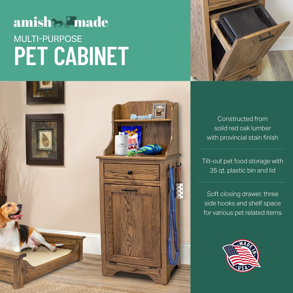 Introducing our versatile Amish-crafted multi-purpose pet cabinet, meticulously designed from exquisite red oak by skilled artisans in America. This exceptional piece seamlessly combines practicality with timeless craftsmanship to elevate both your pet care routine and home decor. Crafted from solid red oak, known for its durability and natural beauty, each cabinet is a testament to the Amish commitment to quality. The wood's rich grain and smooth finish enhance the cabinet's aesthetic appeal, making it a stunning addition to any room. Featuring a unique tilt-out design, this cabinet offers convenient storage for pet essentials while maintaining a sleek and organized appearance. The tilt-out compartment provides easy access to pet food, treats, toys, or grooming supplies, keeping everything neatly concealed yet readily accessible. With its sturdy construction and thoughtfully designed interior, the cabinet serves as a functional and stylish solution for pet care organization. Whether placed in the kitchen, mudroom, or living area, it complements your home decor while catering to your pet's needs with elegance and efficiency. Embrace the beauty of Amish craftsmanship and enhance your pet care routine with our multi-purpose pet cabinet. From its durable red oak construction to its practical tilt-out design, this cabinet is designed to enrich both your home and your pet's life with enduring quality and timeless style.