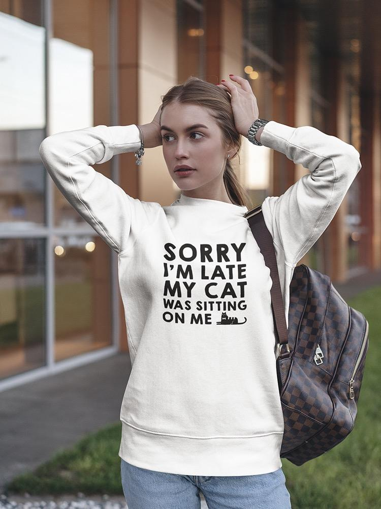 You Can't Go Wrong With This Cute Design With The Perfect Excuse For Being Late. Women's White Sweatshirt. Design by Smartprints.