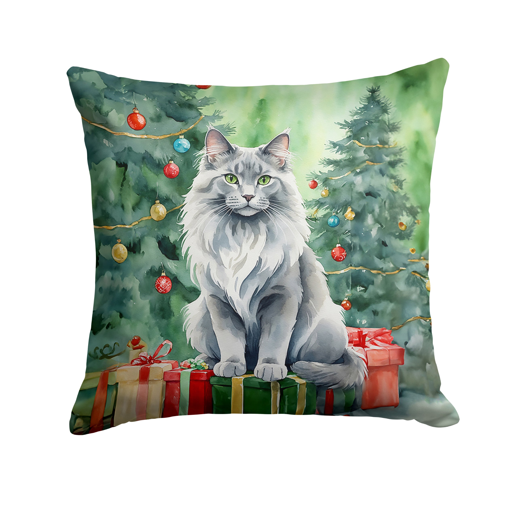 Throw Pillow featuring breed specific Nebelung artwork. Celebrate Christmas with this Christmas Pillow. Revitalize your outdoor or indoor living space with Caroline's Treasures 18x18 Fabric Decorative Pillow. With a generously sized dimension of approximately 18 inches by 18 inches, this pillow makes a comfortable and aesthetic addition to any seating area. Made from a unique, water-resistant material developed by Caroline's Treasures, the pillow sham is 100% polyester fabric that's durable and ready to weather any condition. Its vibrant, full-color artwork will not fade over time as it is dyed with color-fast dyes. Whether you place it on your patio furniture, porch, veranda, or indoor couch, its soft canvas fabric ensures a cozy experience. The pillow is handcrafted in the United States, featuring a sham created from three pieces of fabric and a polyester insert for enduring shape and overstuffed comfort. Despite being robustly built to endure the outdoors, it is as soft and snug as your favorite indoor cushions. Please note, as all our pillows are handmade, sizes may vary slightly, adding to the charm of this unique decorative item.